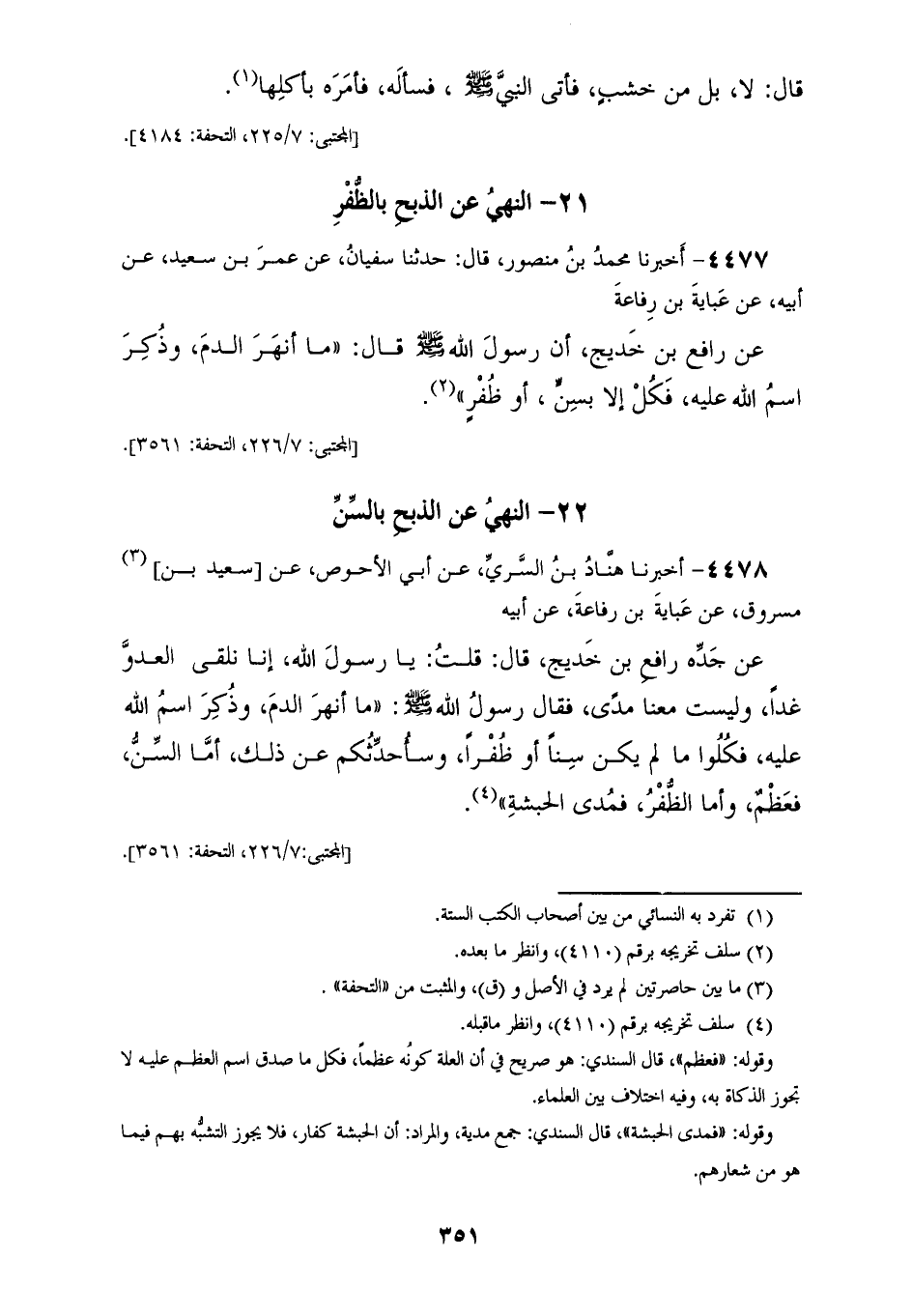 4478 - أَخْبَرَنَا هَنَّادُ بْنُ السَّرِيِّ، عَنْ أَبِي الْأَحْوَصِ، عَنْ سَعِيدِ بْنِ مَسْرُوقٍ، عَنْ عَبَايَةَ بْنِ رِفَاعَةَ، عَنْ أَبِيهِ، عَنْ جَدِّهِ رَافِعِ بْنِ خَدِيجٍ قَالَ: قُلْتُ: يَا رَسُولَ اللهِ إِنَّا نَلْقَى الْعَدُوَّ غَدًا وَلَيْسَتْ مَعَنَا مُدًى فَقَالَ رَسُولُ اللهِ صَلَّى اللهُ عَلَيْهِ وَسَلَّمَ: «§مَا أَنْهَرَ الدَّمَ وَذُكِرَ اسْمُ اللهِ عَلَيْهِ فَكُلُوا مَا لَمْ يَكُنْ سِنًّا أَوْ ظُفْرًا، وَسَأُحَدِّثُكُمْ عَنْ ذَلِكَ أَمَّا السِّنُّ فَعَظْمٌ وَأَمَّا الظُّفْرُ فَمُدَى الْحَبَشَةِ»