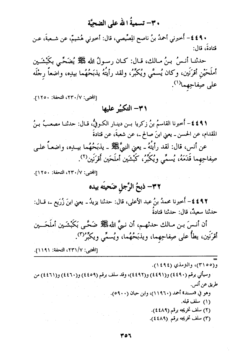 4490 - أَخْبَرَنِي أَحْمَدُ بْنُ نَاصِحٍ الْمِصِّيصِيُّ قَالَ: أَخْبَرَنِي هُشَيْمٌ، عَنْ شُعْبَةَ، عَنْ قَتَادَةَ قَالَ: حَدَّثَنَا أَنَسُ بْنُ مَالِكٍ قَالَ: كَانَ رَسُولُ اللهِ صَلَّى اللهُ عَلَيْهِ وَسَلَّمَ «§يُضَحَّى بِكَبْشَيْنِ أَمْلَحَيْنِ أَقْرَنَيْنِ، وَكَانَ يُسَمِّي وَيُكَبِّرُ وَلَقَدْ رَأَيْتُهُ يَذْبَحُهُمَا بِيَدِهِ وَاضِعًا رِجْلَهُ عَلَى صِفَاحِهِمَا»