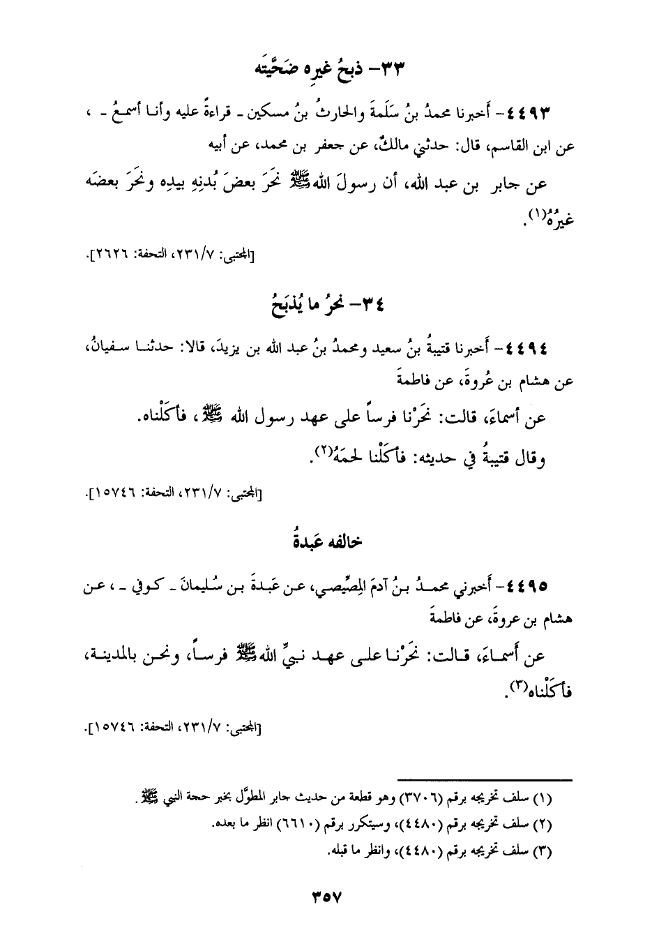 4495 - أَخْبَرَنِي مُحَمَّدُ بْنُ آدَمَ الْمِصِّيصِيُّ عَنْ عَبْدَةُ بْنُ سُلَيْمَانَ، كُوفِيٌّ عَنْ هِشَامِ بْنِ عُرْوَةَ، عَنْ فَاطِمَةَ، عَنْ أَسْمَاءَ قَالَتْ: «§نَحَرْنَا عَلَى عَهْدِ نَبِيِّ اللهِ صَلَّى اللهُ عَلَيْهِ وَسَلَّمَ فَرَسًا وَنَحْنُ بِالْمَدِينَةِ فَأَكَلْنَاهُ»