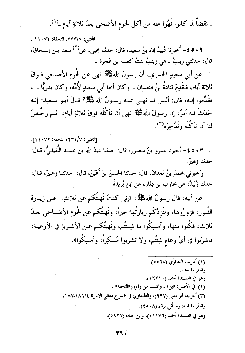4503 - أَخْبَرَنَا عَمْرُو بْنُ مَنْصُورٍ قَالَ: حَدَّثَنَا عَبْدُ اللهِ بْنُ مُحَمَّدٍ النُّفَيْلِيُّ قَالَ: حَدَّثَنَا زُهَيْرٌ. وَأَخْبَرَنِي مُحَمَّدُ بْنُ مَعْدَانَ قَالَ: حَدَّثَنَا الْحَسَنُ بْنُ أَعْيَنَ قَالَ: حَدَّثَنَا زُهَيْرٌ قَالَ: حَدَّثَنَا زُبَيْدُ، عَنْ مُحَارِبِ بْنِ دِثَارٍ، عَنِ ابْنِ بُرَيْدَةَ، عَنْ أَبِيهِ قَالَ: قَالَ رَسُولُ اللهِ صَلَّى اللهُ عَلَيْهِ وَسَلَّمَ: «إِنِّي §كُنْتُ نَهَيْتُكُمْ عَنْ ثَلَاثٍ، عَنْ زِيَارَةِ الْقُبُورِ، فَزُورُوهَا، وَلْتَزِدْكُمْ زِيَارَتُهَا خَيْرًا، وَنَهَيْتُكُمْ عَنْ لُحُومِ الْأَضَاحِيِّ بَعْدَ ثَلَاثٍ، فَكُلُوا مِنْهَا وَأَمْسِكُوا مَا شِئْتُمْ، وَنَهَيْتُكُمْ عَنِ الْأَشْرِبَةِ فِي الْأَوْعِيَةِ، فَاشْرَبُوا فِي أَيِّ وِعَاءٍ شِئْتُمْ، وَلَا تَشْرَبُوا مُسْكِرًا وَأَمْسِكُوا». لَمْ يَذْكُرْ مُحَمَّدٌ: وَأَمْسِكُوا