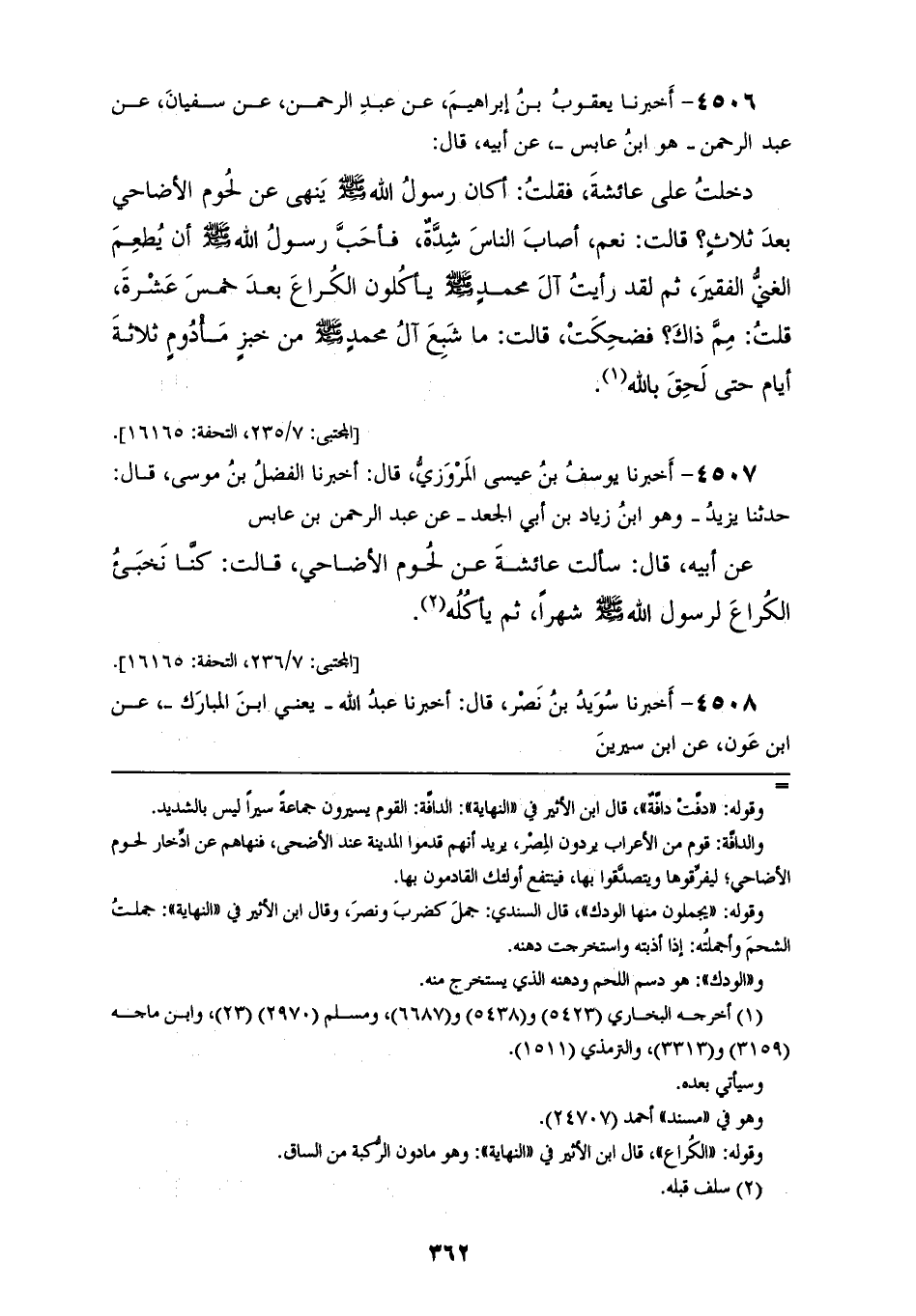 4506 - أَخْبَرَنَا يَعْقُوبُ بْنُ إِبْرَاهِيمَ، عَنْ عَبْدِ الرَّحْمَنِ، عَنْ سُفْيَانَ، عَنْ عَبْدِ الرَّحْمَنِ هُوَ ابْنُ عَابِسٍ، عَنْ أَبِيهِ قَالَ: دَخَلَتُ عَلَى عَائِشَةَ فَقُلْتُ: أَكَانَ رَسُولُ اللهِ صَلَّى اللهُ عَلَيْهِ وَسَلَّمَ «§يَنْهَى عَنْ لُحُومِ الْأَضَاحِيِّ بَعْدَ ثَلَاثٍ؟» قَالَتْ: نَعَمْ، أَصَابَ النَّاسَ شِدَّةٌ، فَأَحَبَّ رَسُولُ اللهِ صَلَّى اللهُ عَلَيْهِ وَسَلَّمَ أَنْ يُطْعِمَ الْغَنِيَّ الْفَقِيرَ ثُمَّ قَالَ: لَقَدْ رَأَيْتُ آلَ مُحَمَّدٍ صَلَّى اللهُ عَلَيْهِ وَسَلَّمَ يَأْكُلُونَ الْكُرَاعَ بَعْدَ خَمْسَ عَشْرَةَ قُلْتُ: مِمَّ ذَاكَ؟ فَضَحِكَتْ فَقَالَتْ: مَا شَبِعَ آلُ مُحَمَّدٍ صَلَّى اللهُ عَلَيْهِ وَسَلَّمَ مِنْ خُبْزٍ مَأْدُومٍ ثَلَاثَةَ أَيَّامٍ حَتَّى لَحِقَ بِاللهِ