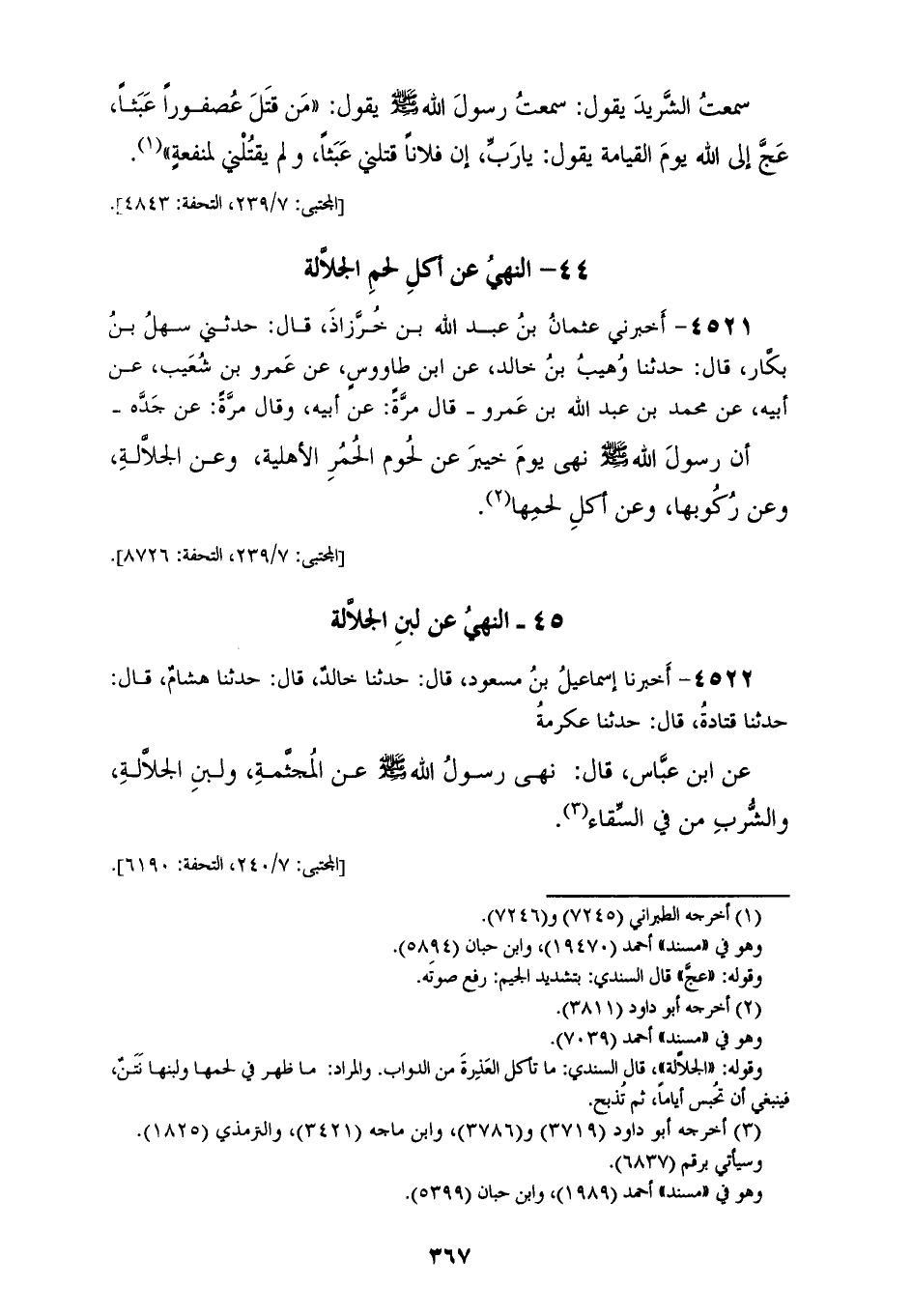 4522 - أَخْبَرَنَا إِسْمَاعِيلُ بْنُ مَسْعُودٍ قَالَ: حَدَّثَنَا خَالِدٌ قَالَ: حَدَّثَنَا هِشَامٌ قَالَ: حَدَّثَنَا قَتَادَةُ، قَالَ: حَدَّثَنَا عِكْرِمَةُ، عَنِ ابْنِ عَبَّاسٍ قَالَ: «§نَهَى رَسُولُ اللهِ صَلَّى اللهُ عَلَيْهِ وَسَلَّمَ عَنِ الْمُجَثَّمَةِ، وَلَبَنِ الْجَلَّالَةِ، وَالشَّرْبِ مِنْ فِيِّ السِّقَاءِ»