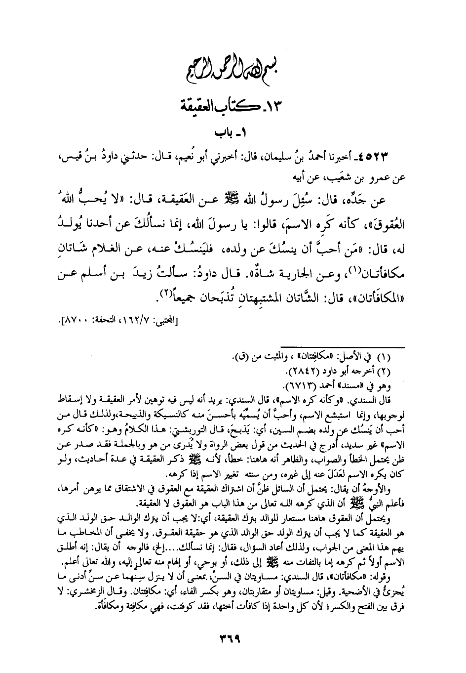 4523 - أَخْبَرَنَا أَحْمَدُ بْنُ سُلَيْمَانَ قَالَ: أَخْبَرَنِي أَبُو نُعَيْمٍ قَالَ: حَدَّثَنِي دَاوُدُ بْنُ قَيْسٍ، عَنْ عَمْرِو بْنِ شُعَيْبٍ، عَنْ أَبِيهِ، عَنْ جَدِّهِ قَالَ: سُئِلَ رَسُولُ اللهِ صَلَّى اللهُ عَلَيْهِ وَسَلَّمَ عَنِ الْعَقِيقَةِ قَالَ: «§لَا يُحِبُّ اللهُ الْعُقُوقَ» كَأَنَّهُ كَرِهَ الِاسْمَ قَالُوا يَا رَسُولَ اللهِ: إِنَّمَا نَسْأَلُكَ عَنْ أَحَدِنَا يُولَدُ لَهُ قَالَ: «مَنْ أَحَبَّ أَنْ يَنْسُكَ عَنْ وَلَدِهِ فَلْيَنْسُكْ عَنْهُ، عَنِ الْغُلَامِ شَاتَانِ مُكَافِأَتَانِ، وَعَنِ الْجَارِيَةِ شَاةٌ» قَالَ دَاوُدُ: سَأَلْتُ زَيْدَ بْنَ أَسْلَمَ عَنِ الْمُكَافِأَتَانِ قَالَ: الشَّاتَانِ الْمُشْتَبِهَتَانِ تُذْبَحَانِ جَمِيعًا