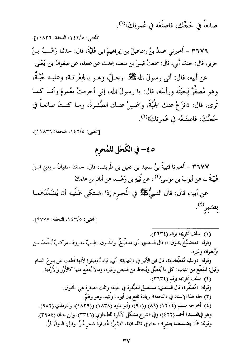 3677 - أَخْبَرَنَا قُتَيْبَةُ بْنُ سَعِيدِ بْنِ جَمِيلِ بْنِ طَرِيفٍ قَالَ: حَدَّثَنَا سُفْيَانُ يَعْنِي ابْنَ عُيَيْنَةَ، عَنْ أَيُّوبَ بْنِ مُوسَى، عَنْ نُبَيْهِ بْنِ وَهْبٍ، عَنْ أَبَانَ بْنِ عُثْمَانَ، عَنْ أَبِيهِ قَالَ: قَالَ النَّبِيُّ صَلَّى اللهُ عَلَيْهِ وَسَلَّمَ فِي «§الْمُحْرِمِ إِذَا اشْتَكَى عَيْنَيْهِ أَنْ يُضَمِّدَهُمَا بِصَبِرٍ»
