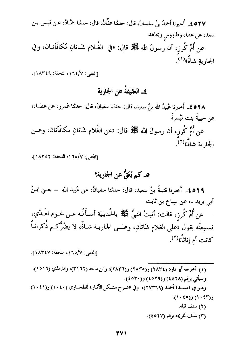 4527 - أَخْبَرَنَا أَحْمَدُ بْنُ سُلَيْمَانَ قَالَ: حَدَّثَنَا عَفَّانُ قَالَ: حَدَّثَنَا حَمَّادٌ، عَنْ قَيْسِ بْنِ سَعْدٍ، عَنْ عَطَاءٍ، وَطَاوُسٍ، وَمُجَاهِدٍ، عَنْ أُمِّ كُرْزٍ، أَنَّ رَسُولَ اللهِ صَلَّى اللهُ عَلَيْهِ وَسَلَّمَ قَالَ: «§فِي الْغُلَامِ شَاتَانِ مُكَافَأَتَانِ، وَفِي الْجَارِيَةِ شَاةٌ»