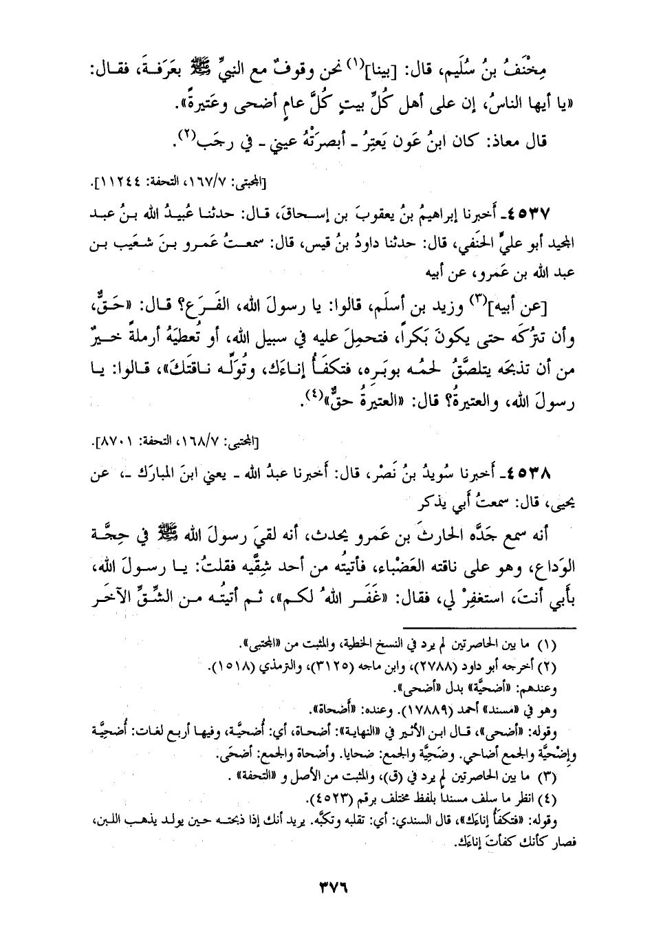 4538 - أَخْبَرَنَا سُوَيْدُ بْنُ نَصْرٍ قَالَ: أَخْبَرَنَا عَبْدُ اللهِ يَعْنِي ابْنَ الْمُبَارَكِ، عَنْ يَحْيَى قَالَ: سَمِعْتُ أَبِي يَذْكُرُ أَنَّهُ سَمِعَ جَدَّهُ الْحَارِثَ بْنَ عَمْرٍو، يُحَدِّثُ أَنَّهُ لَقِيَ رَسُولَ اللهِ صَلَّى اللهُ عَلَيْهِ وَسَلَّمَ فِي حَجَّةِ الْوَدَاعِ وَهُوَ عَلَى نَاقَتِهِ الْعَضْبَاءِ، فَأَتَيْتُهُ مِنْ أَحَدِ شِقَّيْهِ فَقُلْتُ: يَا رَسُولَ اللهِ بِأَبِي أَنْتَ اسْتَغْفِرْ لِي فَقَالَ: «§غَفَرَ اللهُ لَكُمْ» ثُمَّ أَتَيْتُهُ مِنَ الشِّقِّ الْآخَرِ أَرْجُو أَنْ يَخُصَّنِي دُونَهُمْ فَقُلْتُ: يَا رَسُولَ اللهِ اسْتَغْفِرْ لِي فَقَالَ بِيَدِهِ: «غَفَرَ اللهُ لَكُمْ» فَقَالَ رَجُلٌ مِنَ النَّاسِ: يَا رَسُولَ اللهِ الْعَتَائِرُ وَالْفَرَاعُ؟ فَقَالَ: «مَنْ شَاءَ عَتَرَ، وَمَنْ شَاءَ لَمْ يَعْتِرْ، وَمَنْ شَاءَ فَرَّعَ، وَمَنْ شَاءَ لَمْ يُفَرِّعْ فِي الْغَنَمِ أُضْحِيَّتُهَا» وَقَبَضَ أَصَابِعَهُ إِلَّا وَاحِدَةً