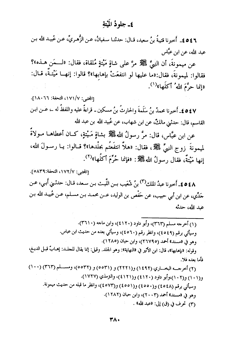 4547 - أَخْبَرَنَا مُحَمَّدُ بْنُ سَلَمَةَ، وَالْحَارِثُ بْنُ مِسْكِينٍ، قِرَاءَةً عَلَيْهِ وَاللَّفْظُ لَهُ عَنِ ابْنِ الْقَاسِمِ قَالَ: حَدَّثَنِي مَالِكٌ، عَنِ ابْنِ شِهَابٍ، عَنْ عُبَيْدِ اللهِ بْنِ عَبْدِ اللهِ، عَنِ ابْنِ عَبَّاسٍ قَالَ: مَرَّ رَسُولُ اللهِ صَلَّى اللهُ عَلَيْهِ وَسَلَّمَ بِشَاةٍ مَيِّتَةٍ كَانَ أَعْطَاهَا مَوْلَاةً لِمَيْمُونَةَ زَوْجِ النَّبِيِّ صَلَّى اللهُ عَلَيْهِ وَسَلَّمَ فَقَالَ: «§هَلَّا انْتَفَعْتُمْ بِجِلْدِهَا؟» قَالُوا: يَا رَسُولَ اللهِ إِنَّهَا مَيْتَةٌ فَقَالَ رَسُولُ اللهِ صَلَّى اللهُ عَلَيْهِ وَسَلَّمَ: «فَإِنَّمَا حُرِّمَ أَكْلُهَا»