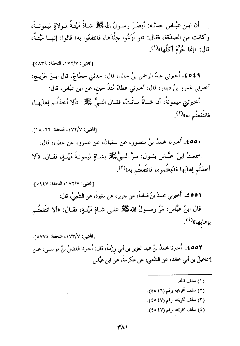 4549 - أَخْبَرَنِي عَبْدُ الرَّحْمَنِ بْنُ خَالِدٍ قَالَ: حَدَّثَنِي حَجَّاجٌ قَالَ ابْنُ جُرَيْجٍ، أَخْبَرَنِي عَمْرُو بْنُ دِينَارٍ قَالَ: أَخْبَرَنِي عَطَاءٌ، مُنْذُ حِينٍ عَنِ ابْنِ عَبَّاسٍ قَالَ: أَخْبَرْتِنِي مَيْمُونَةُ، أَنَّ شَاةً مَاتَتْ فَقَالَ النَّبِيُّ صَلَّى اللهُ عَلَيْهِ وَسَلَّمَ: «§أَلَا أَخَذْتُمْ إِهَابَهَا فَانْتَفَعْتُمْ بِهِ؟»