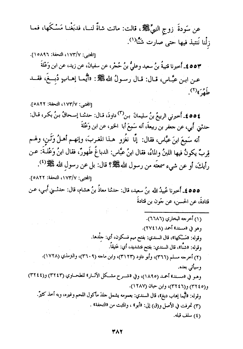 4553 - أَخْبَرَنَا قُتَيْبَةُ بْنُ سَعِيدٍ، وَعَلِيُّ بْنُ حُجْرٍ، عَنْ سُفْيَانَ، عَنْ زَيْدٍ، عَنِ ابْنِ وَعْلَةَ، عَنِ ابْنِ عَبَّاسٍ قَالَ: قَالَ رَسُولُ اللهِ صَلَّى اللهُ عَلَيْهِ وَسَلَّمَ: «§أَيُّمَا إِهَابٍ دُبِغَ فَقَدْ طَهُرَ»