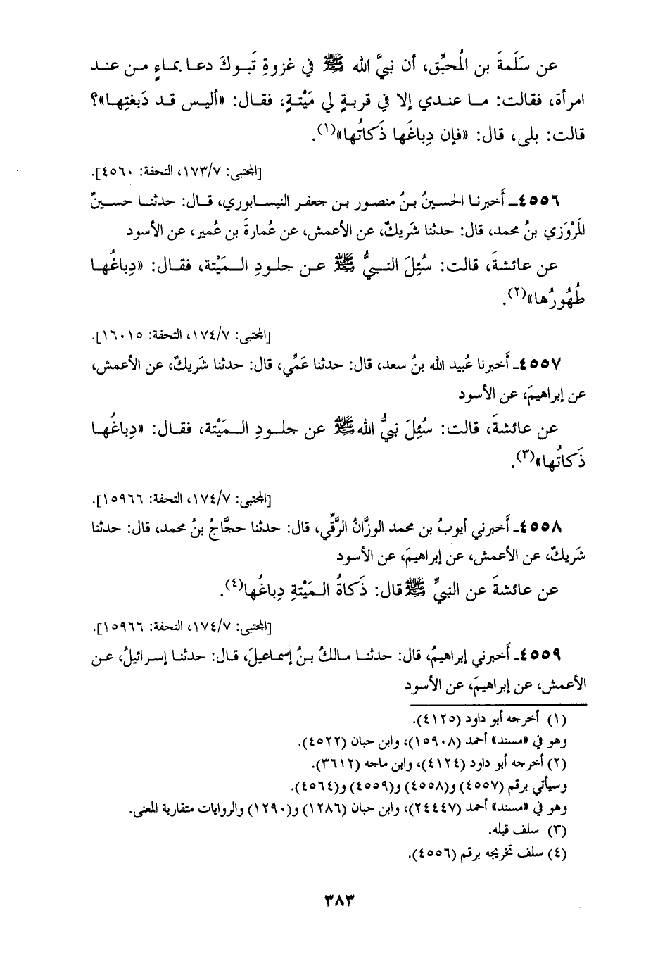 4556 - أَخْبَرَنَا الْحُسَيْنُ بْنُ مَنْصُورِ بْنِ جَعْفَرٍ النَّيْسَابُورِيُّ قَالَ: حَدَّثَنَا حُسَيْنٌ الْمَرْوَزِيُّ بْنُ مُحَمَّدٍ قَالَ: حَدَّثَنَا شَرِيكٌ، عَنِ الْأَعْمَشِ، عَنْ عُمَارَةَ بْنِ عُمَيْرٍ، عَنِ الْأَسْوَدِ، عَنْ عَائِشَةَ قَالَتْ: سُئِلَ النَّبِيُّ صَلَّى اللهُ عَلَيْهِ وَسَلَّمَ عَنْ جُلُودِ الْمَيْتَةِ فَقَالَ: «§دِبَاغُهَا طَهُورُهَا»
