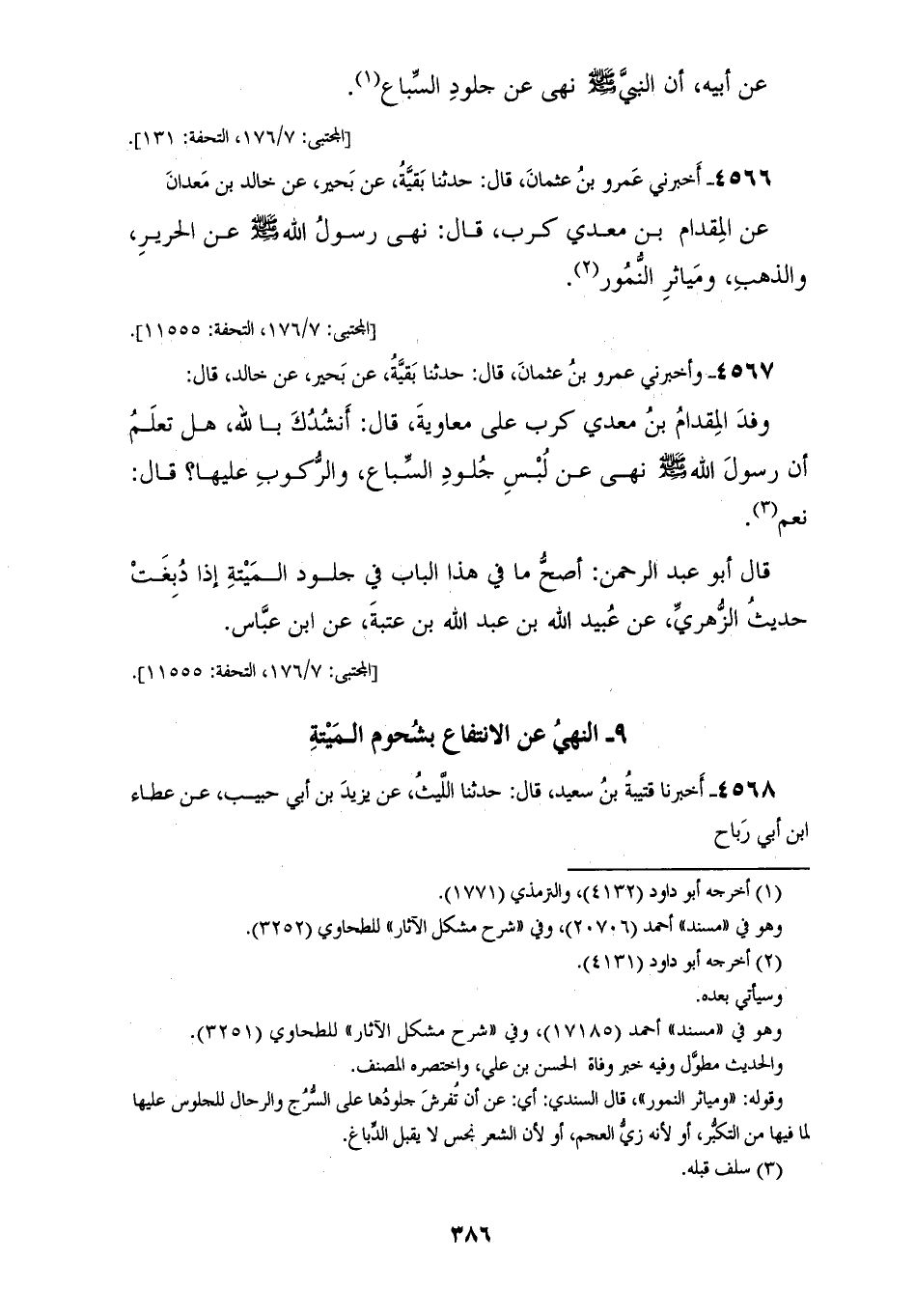 4567 - وأَخْبَرَنِي عَمْرُو بْنُ عُثْمَانَ قَالَ: حَدَّثَنَا بَقِيَّةُ، عَنْ بَحِيرٍ، عَنْ خَالِدٍ قَالَ: وَفَدَ الْمِقْدَامُ بْنُ مَعْدِ يَكْرِبَ عَلَى مُعَاوِيَةَ، قَالَ: أَنْشُدُكَ بِاللهِ، هَلْ تَعْلَمُ أَنَّ رَسُولَ اللهِ صَلَّى اللهُ عَلَيْهِ وَسَلَّمَ §نَهَى عَنْ لُبْسِ جُلُودِ السِّبَاعِ وَالرُّكُوبِ عَلَيْهَا؟ قَالَ: «نَعَمْ». قَالَ أَبُو عَبْدِ الرَّحْمَنِ: أَصَحُّ مَا فِي هَذَا الْبَابِ فِي جُلُودِ الْمَيْتَةِ إِذَا دُبِغَتْ حَدِيثُ الزُّهْرِيِّ عَنْ عُبَيْدِ اللهِ بْنِ عَبْدِ اللهِ بْنِ عُتْبَةَ عَنِ ابْنِ عَبَّاسٍ