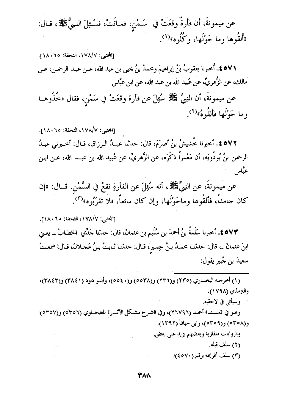 4570 - أَخْبَرَنَا قُتَيْبَةُ بْنُ سَعِيدٍ قَالَ: حَدَّثَنَا سُفْيَانُ، عَنِ الزُّهْرِيِّ، عَنْ عُبَيْدِ اللهِ بْنِ عَبْدِ اللهِ بْنِ عُتْبَةَ، عَنِ ابْنِ عَبَّاسٍ، عَنْ مَيْمُونَةَ، أَنَّ فَأْرَةً، وَقَعَتْ، فِي سَمْنٍ فَمَاتَتْ، فَسُئِلَ النَّبِيُّ صَلَّى اللهُ عَلَيْهِ وَسَلَّمَ فَقَالَ: «§أَلْقُوهَا وَمَا حَوْلَهَا وَكُلُوهُ»