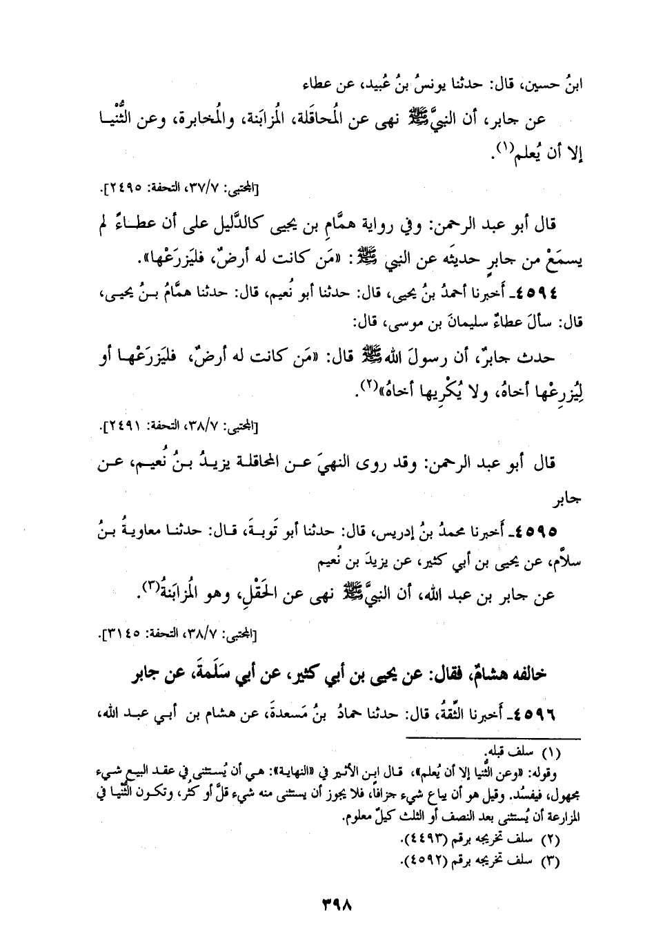 4595 - أَخْبَرَنَا مُحَمَّدُ بْنُ إِدْرِيسَ، قَالَ: حَدَّثَنَا أَبُو تَوْبَةَ قَالَ: حَدَّثَنَا مُعَاوِيَةُ بْنُ سَلَامٍ، عَنْ يَحْيَى بْنِ أَبِي كَثِيرٍ، عَنْ يَزِيدَ بْنِ نُعَيْمٍ، عَنْ جَابِرِ بْنِ عَبْدِ اللهِ، أَنَّ النَّبِيَّ صَلَّى اللهُ عَلَيْهِ وَسَلَّمَ «§نَهَى عَنِ الْحَقْلِ، وَهُو الْمُزَابَنَةُ،» خَالَفَهُ هِشَامٌ فَقَالَ: عَنْ يَحْيَى بْنِ أَبِي كَثِيرٍ عَنْ أَبِي سَلَمَةَ عَنْ جَابِرٍ
