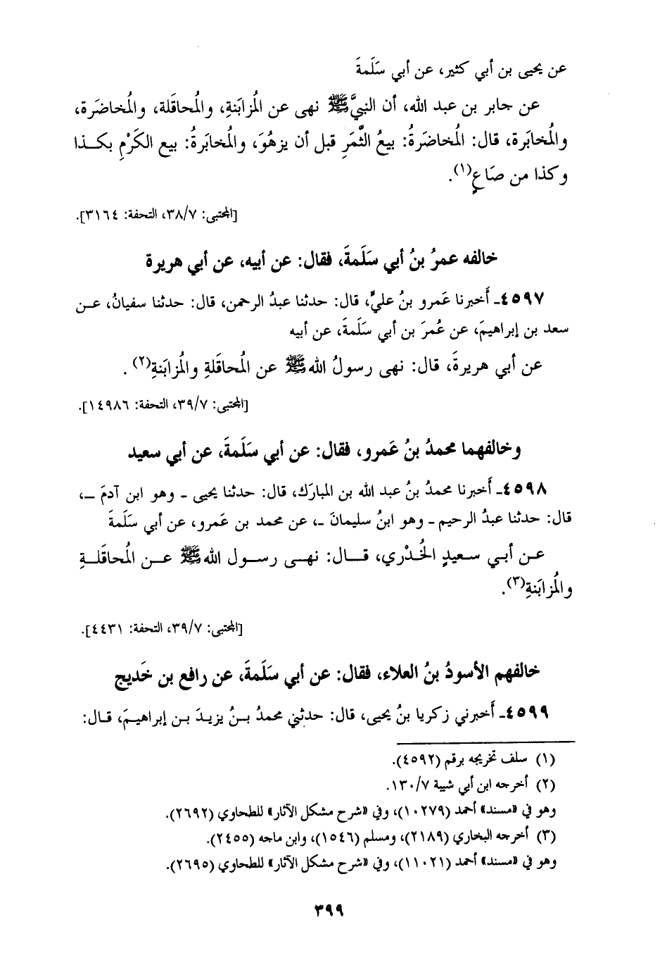 4597 - أَخْبَرَنَا عَمْرُو بْنُ عَلِيٍّ قَالَ: حَدَّثَنَا عَبْدُ الرَّحْمَنِ قَالَ: حَدَّثَنَا سُفْيَانُ، عَنْ سَعْدِ بْنِ إِبْرَاهِيمَ، عَنْ عُمَرَ بْنِ أَبِي سَلَمَةَ، عَنْ أَبِيهِ، عَنْ أَبِي هُرَيْرَةَ، قَالَ: «§نَهَى رَسُولُ اللهِ صَلَّى اللهُ عَلَيْهِ وَسَلَّمَ عَنِ الْمُحَاقَلَةِ، وَالْمُزَابَنَةِ» وَخَالَفَهُمَا مُحَمَّدُ بْنُ عَمْرٍو فَقَالَ: عَنْ أَبِي سَلَمَةَ عَنْ أَبِي سَعِيدٍ