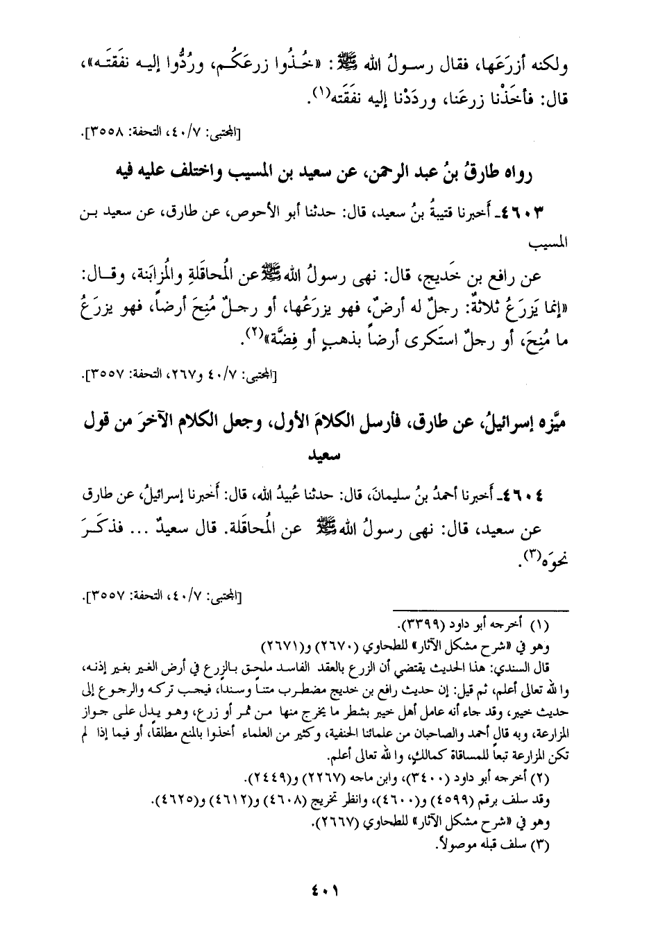 4603 - أَخْبَرَنَا قُتَيْبَةُ بْنُ سَعِيدٍ قَالَ: حَدَّثَنَا أَبُو الْأَحْوَصِ، عَنْ طَارِقٍ، عَنْ سَعِيدِ بْنِ الْمُسَيِّبِ، عَنْ رَافِعِ بْنِ خَدِيجٍ قَالَ: نَهَى رَسُولُ اللهِ صَلَّى اللهُ عَلَيْهِ وَسَلَّمَ عَنِ الْمُحَاقَلَةِ، وَالْمُزَابَنَةِ وَقَالَ: " إِنَّمَا §يَزْرَعُ ثَلَاثَةٌ: رَجُلٌ لَهُ أَرْضٌ فَهُوَ يَزْرَعْهَا أَوْ رَجُلٌ مُنِحَ أَرْضًا، فَهُوَ يَزْرَعُ مَا مُنِحَ أَوْ رَجُلٌ اسْتَكْرَى أَرْضًا بِذَهَبٍ أَوْ فِضَّةٍ " مَيَّزَهُ إِسْرَائِيلُ عَنْ طَارِقٍ فَأَرْسَلَ الْكَلَامَ الْأَوَّلَ وَجَعَلَ الْكَلَامَ الْآخِرَ مِنْ قَوْلِ سَعِيدٍ
