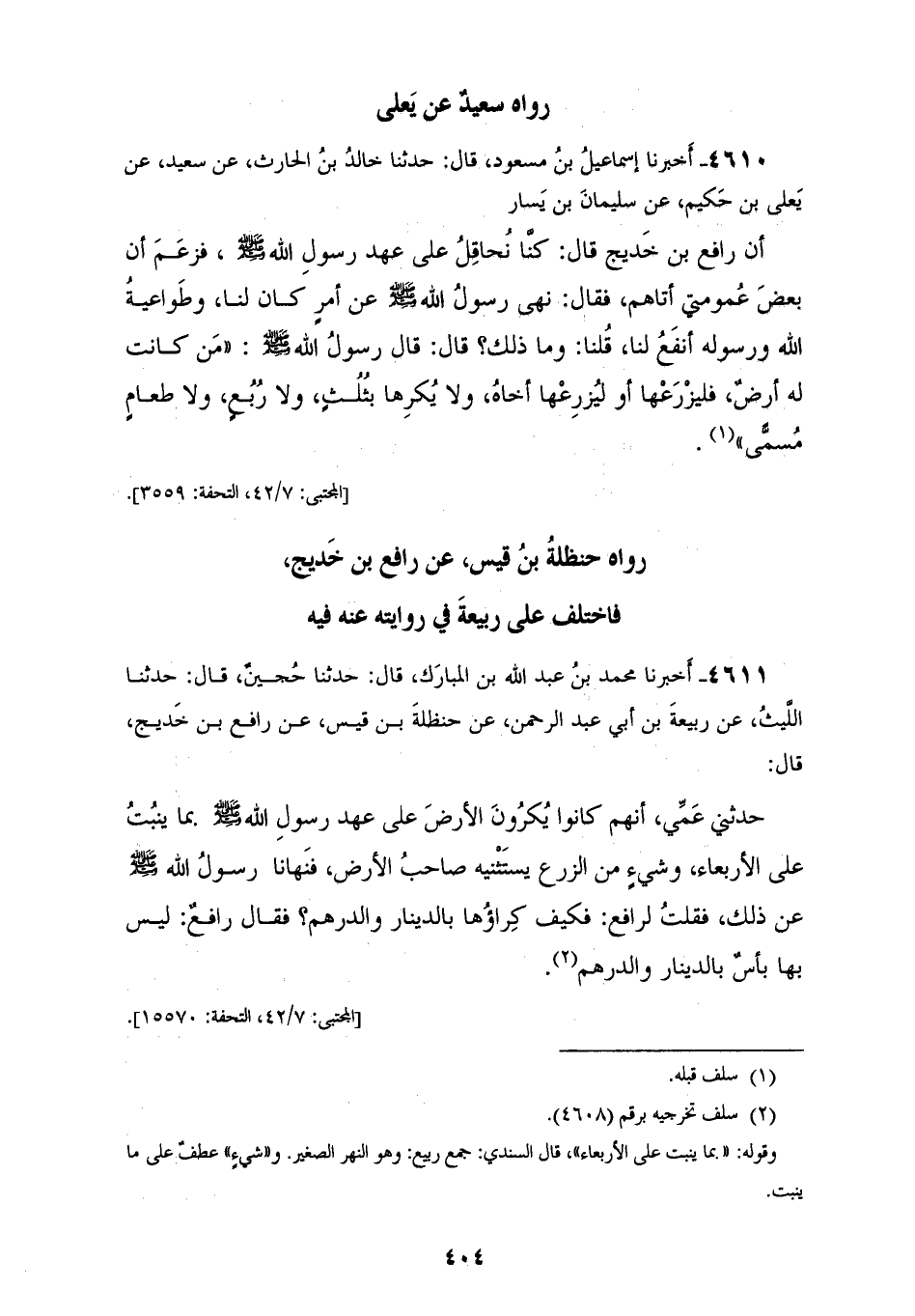 4610 - أَخْبَرَنَا إِسْمَاعِيلُ بْنُ مَسْعُودٍ قَالَ: حَدَّثَنَا خَالِدُ بْنُ الْحَارِثِ، عَنْ سَعِيدٍ، عَنْ يَعْلَى بْنِ حَكِيمٍ، عَنْ سُلَيْمَانَ بْنِ يَسَارٍ، أَنَّ رَافِعَ بْنَ خَدِيجٍ قَالَ: كُنَّا نُحَاقِلُ عَلَى عَهْدِ رَسُولِ اللهِ صَلَّى اللهُ عَلَيْهِ وَسَلَّمَ فَزَعَمَ أَنَّ بَعْضَ عُمُومَتِي أَتَاهُمْ فَقَالَ: نَهَى رَسُولُ اللهِ صَلَّى اللهُ عَلَيْهِ وَسَلَّمَ عَنْ أَمْرٍ كَانَ لَنَا وَطَوَاعِيَةُ اللهِ وَرَسُولِهِ أَنْفَعُ لَنَا قُلْنَا: وَمَا ذَلِكَ؟ قَالَ: قَالَ رَسُولُ اللهِ صَلَّى اللهُ عَلَيْهِ وَسَلَّمَ: «§مَنْ كَانَتْ لَهُ أَرْضٌ، فَلْيَزْرَعْهَا أَوْ لِيُزْرِعْهَا أَخَاهُ وَلَا يُكْرِهَا بِثُلُثٍ، وَلَا رُبْعٍ وَلَا طَعَامٍ مُسَمًّى» رَوَاهُ حَنْظَلَةُ بْنُ قَيْسٍ عَنْ رَافِعِ بْنِ خَدِيجٍ فَاخْتُلِفَ عَلَى رَبِيعَةَ فِي رِوَايَتِهِ عَنْهُ فِيهِ