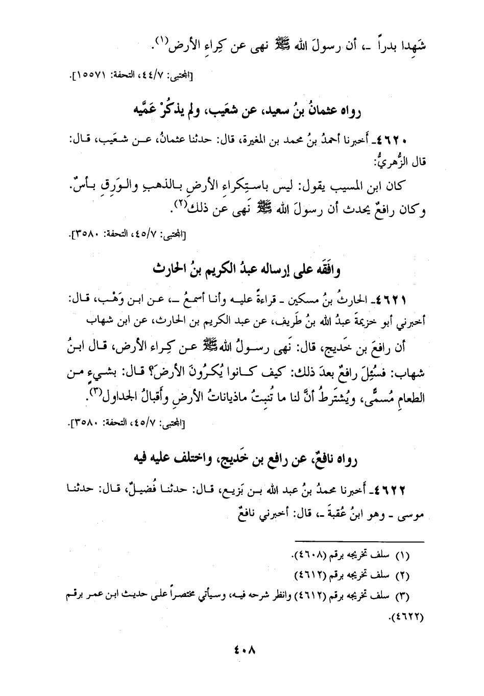 4621 - الْحَارِثُ بْنُ مِسْكِينٍ قِرَاءَةً عَلَيْهِ وَأَنَا أَسْمَعُ، عَنِ ابْنِ وَهْبٍ قَالَ: أَخْبَرَنِي أَبُو خُزَيْمَةَ عَبْدُ اللهِ بْنُ طَرِيفٍ، عَنْ عَبْدِ الْكَرِيمِ بْنِ الْحَارِثِ، عَنِ ابْنِ شِهَابٍ، أَنَّ رَافِعَ بْنَ خَدِيجٍ قَالَ: «§نَهَى رَسُولُ اللهِ صَلَّى اللهُ عَلَيْهِ وَسَلَّمَ عَنْ كِرَاءِ الْأَرْضِ» قَالَ ابْنُ شِهَابٍ: فَسُئِلَ رَافِعٌ بَعْدَ ذَلِكَ كَيْفَ كَانُوا يُكْرُونَ الْأَرْضَ قَالَ: بِشَيْءٍ مِنَ الطَّعَامِ مُسَمًّى، وَيُشْتَرَطُ أَنَّ لَنَا مَا تُنْبِتُ مَاذِيَانَاتُ الْأَرْضِ، وَأَقْبَالُ الْجَدَاوِلِ، رَوَاهُ نَافِعٌ عَنْ رَافِعِ بْنِ خَدِيجٍ وَاخْتُلِفَ عَلَيْهِ فِيهِ