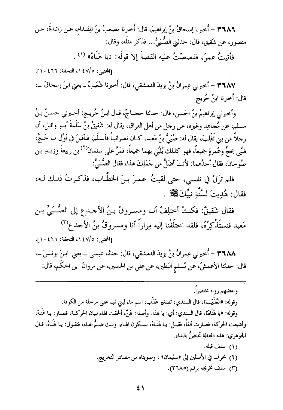 3687 - أَخْبَرَنِي عِمْرَانُ بْنُ يَزِيدَ الدِّمَشْقِيُّ قَالَ: أَخْبَرَنَا شُعَيْبٌ يَعْنِي ابْنَ إِسْحَاقَ قَالَ: أَخْبَرَنَا ابْنُ جُرَيْجٍ، وَأَخْبَرَنِي إِبْرَاهِيمُ بْنُ الْحَسَنِ قَالَ: حَدَّثَنَا حَجَّاجٌ، قَالَ ابْنُ جُرَيْجٍ، أَخْبَرَنِي حَسَنُ بْنُ مُسْلِمٍ، عَنْ مُجَاهِدٍ، وَغَيْرِهِ، عَنْ رَجُلٍ، مِنْ أَهْلِ الْعِرَاقِ يُقَالُ لَهُ: شَقِيقُ بْنُ سَلَمَةَ أَبُو وَائِلٍ §أَنَّ رَجُلًا مِنْ بَنِي تَغْلِبَ يُقَالُ لَهُ: صُّبَيُّ بْنُ مَعْبَدٍ كَانَ نَصْرَانِيًّا فَأَسْلَمَ، فَأَقْبَلَ فِي أَوَّلِ مَا حَجَّ فَلَبَّى بِحَجٍّ وَعُمْرَةٍ جَمِيعًا، فَهُوَ كَذَلِكَ يُلَبِّي بِهِمَا جَمِيعًا فَمَرَّ عَلَى سَلْمَانَ بْنِ رَبِيعَةَ وَزَيْدِ بْنِ صُوحَانَ، فَقَالَ أَحَدُهُمَا: لَأَنْتَ أَضَلُّ مِنْ جَمَلِكَ هَذَا، فَقَالَ الصُّبَيُّ: فَلَمْ تَزَلْ فِي نَفْسِي حَتَّى لَقِيتُ عُمَرَ بْنَ الْخَطَّابِ فَذَكَرْتُ ذَلِكَ لَهُ فَقَالَ: هُدِيتَ لِسُنَّةِ نَبِيِّكَ صَلَّى اللهُ عَلَيْهِ وَسَلَّمَ، فَقَالَ شَقِيقٌ: فَكُنْتُ أَخْتَلِفُ أَنَا وَمَسْرُوقُ بْنُ الْأَجْدَعِ إِلَى الصُّبَيِّ بْنِ مَعْبَدٍ فنَسْتَذْكِرُهُ، فَلَقَدِ اخْتَلَفْنَا إِلَيْهِ مِرَارًا أَنَا وَمَسْرُوقُ بْنُ الْأَجْدَعِ