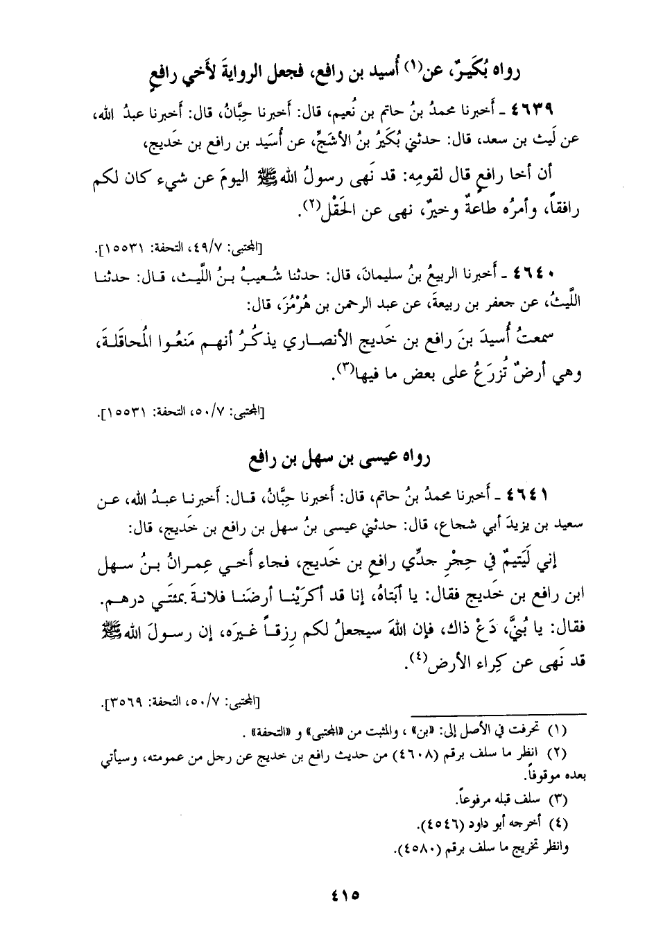 4639 - أَخْبَرَنَا مُحَمَّدُ بْنُ حَاتِمِ بْنِ نُعَيْمٍ قَالَ: أَخْبَرَنَا حَبَّانُ قَالَ: أَخْبَرَنَا عَبْدُ اللهِ، عَنْ لَيْثِ بْنِ سَعْدٍ قَالَ: حَدَّثَنِي بُكَيْرُ بْنُ الْأَشَجِّ، عَنْ أُسَيْدِ بْنِ رَافِعِ بْنِ خَدِيجٍ، أَنَّ أَخَا، رَافِعٍ قَالَ لِقَوْمِهِ: قَدْ نَهَى رَسُولُ اللهِ صَلَّى اللهُ عَلَيْهِ وَسَلَّمَ الْيَوْمَ عَنْ شَيْءٍ كَانَ لَكُمْ رَافِقًا «§وَأَمْرُهُ طَاعَةٌ وَخَيْرٌ نَهَى عَنِ الْحَقْلِ»