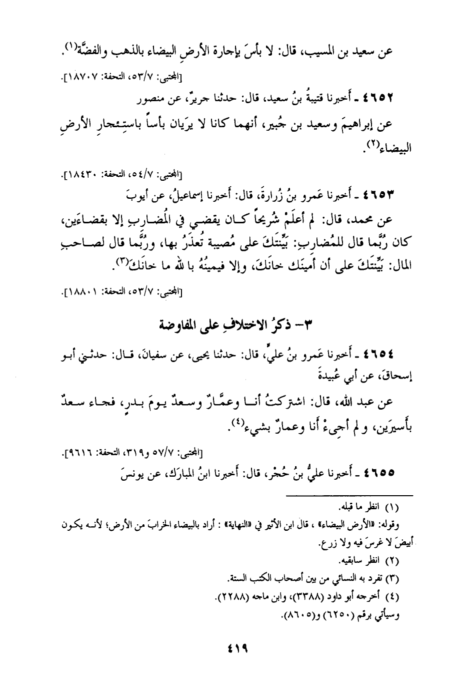 4652 - أَخْبَرَنَا قُتَيْبَةُ بْنُ سَعِيدٍ قَالَ: حَدَّثَنَا جَرِيرٌ، عَنْ مَنْصُورٍ، عَنْ إِبْرَاهِيمَ، وَسَعِيدِ بْنِ جُبَيْرٍ «أَنَّهُمَا كَانَا §لَا يَرَيَانِ بَأْسًا بِاسْتِئْجَارِ الْأَرْضِ الْبَيْضَاءِ»
