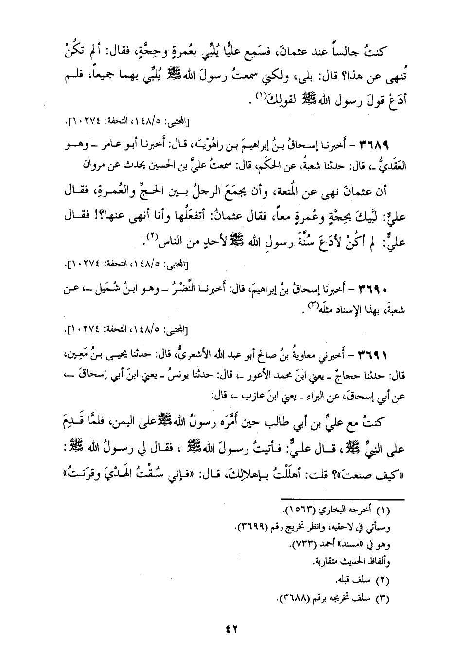 3689 - أَخْبَرَنَا إِسْحَاقُ بْنُ إِبْرَاهِيمَ بْنُ رَاهُوَيْهِ قَالَ: أَخْبَرَنَا أَبُو عَامِرٍ، وَهُوَ الْعَقَدِيُّ قَالَ: حَدَّثَنَا شُعْبَةُ، عَنِ الْحَكَمِ قَالَ: سَمِعْتُ عَلِيَّ بْنَ الْحُسَيْنِ، يُحَدِّثُ عَنْ مَرْوَانَ، أَنَّ عُثْمَانَ «نَهَى عَنِ الْمُتْعَةِ، وَأَنْ يَجْمَعَ الرَّجُلُ بَيْنَ الْحَجِّ وَالْعُمْرَةِ»، فَقَالَ عَلِيٌّ: لَبَّيْكَ بِحَجَّةٍ وَعُمْرَةٍ مَعًا فَقَالَ عُثْمَانُ: أَتَفْعَلُهَا وَأَنَا أَنْهَى عَنْهُمَا، فَقَالَ عَلِيٌّ: §لَمْ أَكُنْ لِأَدَعَ سُنَّةَ رَسُولِ اللهِ صَلَّى اللهُ عَلَيْهِ وَسَلَّمَ لِأَحَدٍ مِنَ النَّاسِ