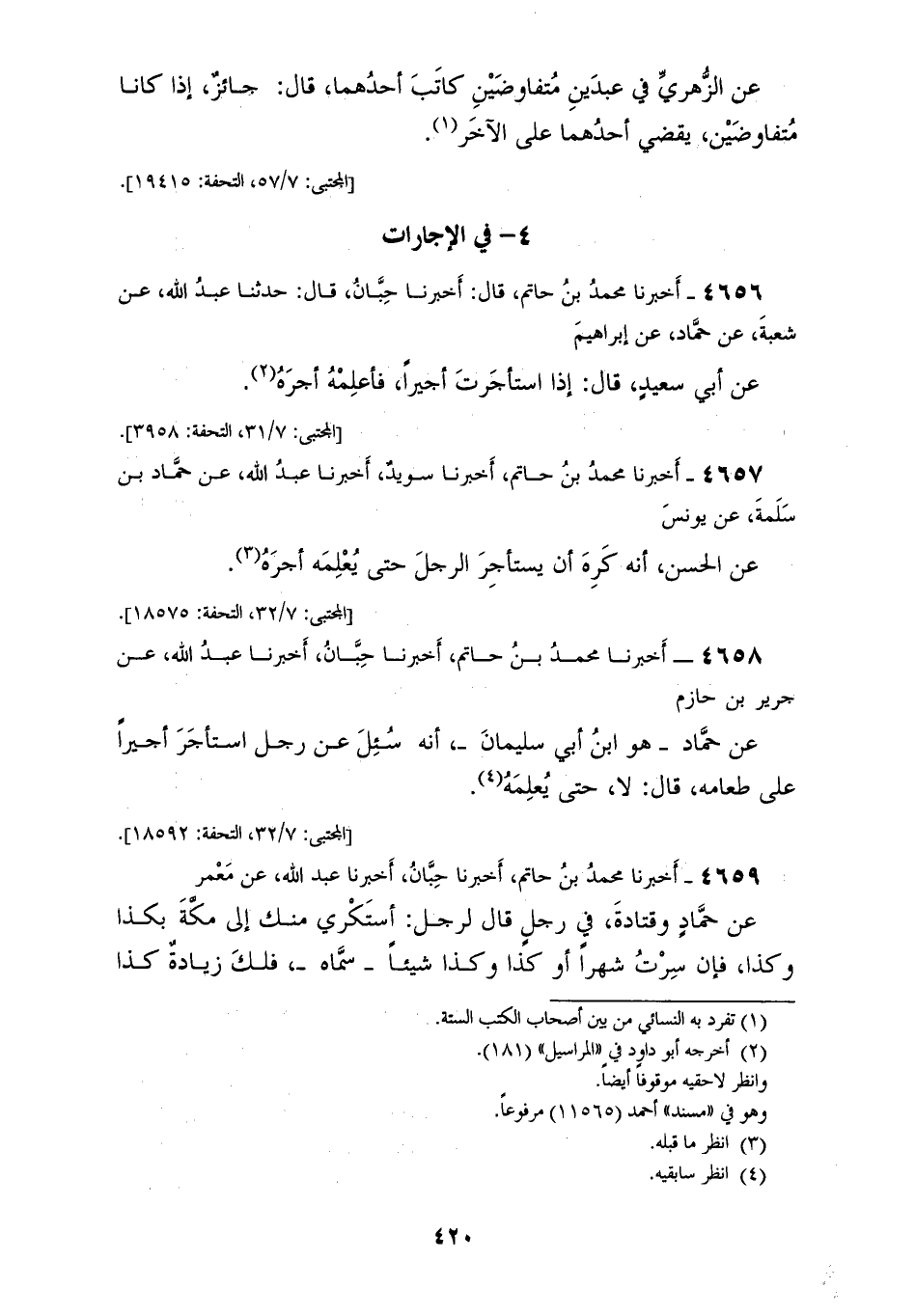 4658 - أَخْبَرَنَا مُحَمَّدُ بْنُ حَاتِمٍ، أَخْبَرَنَا حَبَّانُ، أَخْبَرَنَا عَبْدُ اللهِ، عَنْ جَرِيرِ بْنِ حَازِمٍ، عَنْ حَمَّادٍ هُوَ ابْنُ أَبِي سُلَيْمَانَ أَنَّهُ سُئِلَ عَنْ رَجُلٍ §اسْتَأْجَرَ أَجِيرًا عَلَى طَعَامِهِ، قَالَ: «لَا، حَتَّى يُعْلِمَهُ»