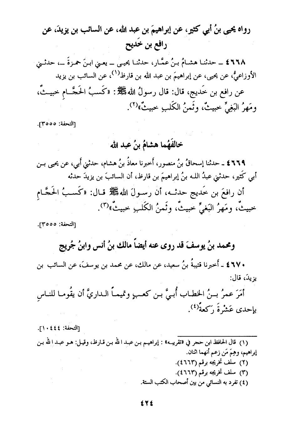 4669 - حَدَّثَنَا إِسْحَاقُ بْنُ مَنْصُورٍ، أَخْبَرَنَا مُعَاذُ بْنُ هِشَامٍ، حَدَّثَنِي أَبِي، عَنْ يَحْيَى بْنِ أَبِي كَثِيرٍ، حَدَّثَنِي عَبْدُ اللهِ بْنُ إِبْرَاهِيمَ بْنِ قَارِظٍ، أَنَّ السَّائِبَ بْنَ يَزِيدَ، حَدَّثَهُ أَنَّ رَافِعَ بْنَ خَدِيجٍ حَدَّثَهُ أَنَّ رَسُولَ اللهِ صَلَّى اللهُ عَلَيْهِ وَسَلَّمَ قَالَ: «§كَسْبُ الْحَجَّامِ خَبِيثٌ، وَمَهْرُ الْبَغِيِّ خَبِيثٌ، وَثَمَنُ الْكَلْبِ خَبِيثٌ» وَمُحَمَّدُ بْنُ يُوسُفَ قَدْ رَوَى عَنْهُ أَيْضًا مَالِكُ بْنُ أَنَسٍ وَابْنُ جُرَيْجٍ