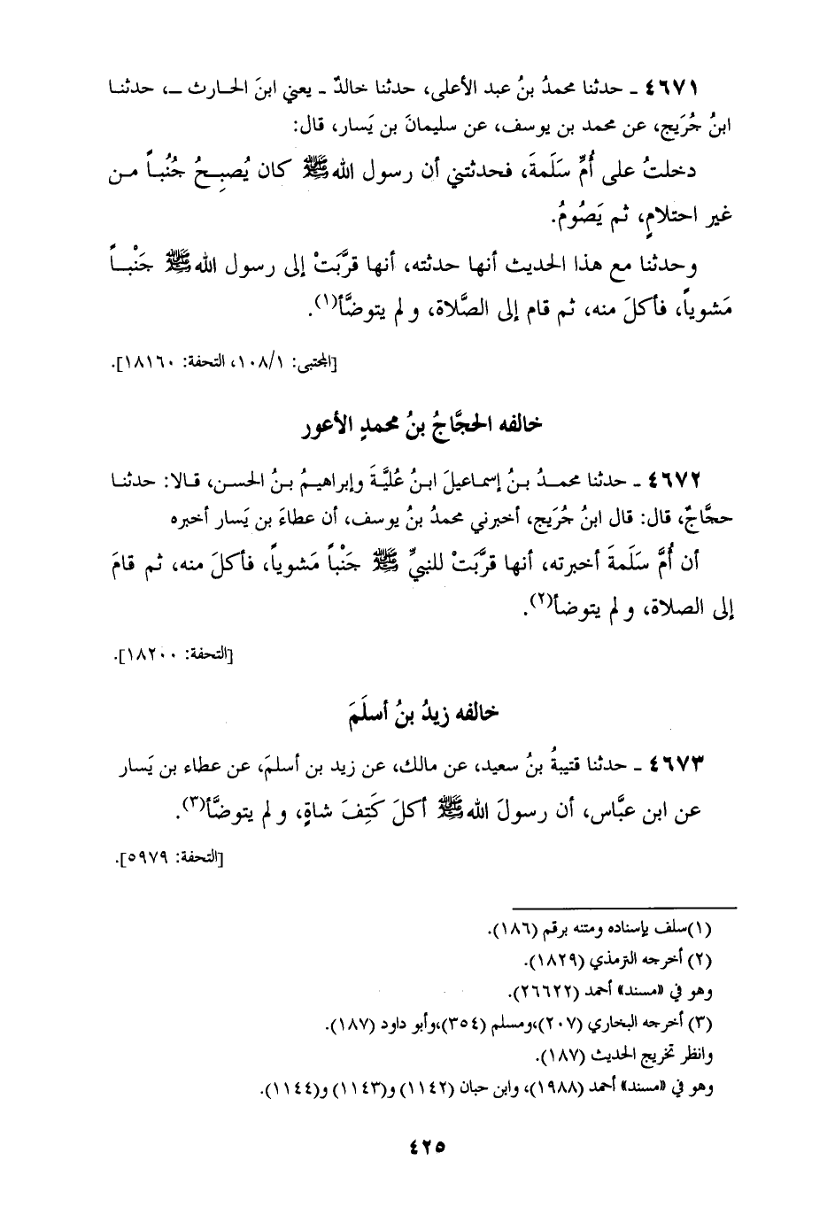 4672 - حَدَّثَنَا مُحَمَّدُ بْنُ إِسْمَاعِيلَ ابْنُ عُلَيَّةَ، وَإِبْرَاهِيمُ بْنُ الْحَسَنِ قَالَا: حَدَّثَنَا حَجَّاجٌ قَالَ: قَالَ ابْنُ جُرَيْجٍ أَخْبَرَنِي مُحَمَّدُ بْنُ يُوسُفَ، أَنَّ عَطَاءَ بْنَ يَسَارٍ، أَخْبَرَهُ أَنَّ أُمَّ سَلَمَةَ أَخْبَرَتْهُ أَنَّهَا «§قَرَّبَتْ لِلنَّبِيِّ صَلَّى اللهُ عَلَيْهِ وَسَلَّمَ جَنْبًا مَشْوِيًّا، فَأَكَلَ مِنْهُ ثُمَّ قَامَ إِلَى الصَّلَاةِ وَلَمْ يَتَوَضَّأْ» خَالَفَهُ زَيْدُ بْنُ أَسْلَمَ