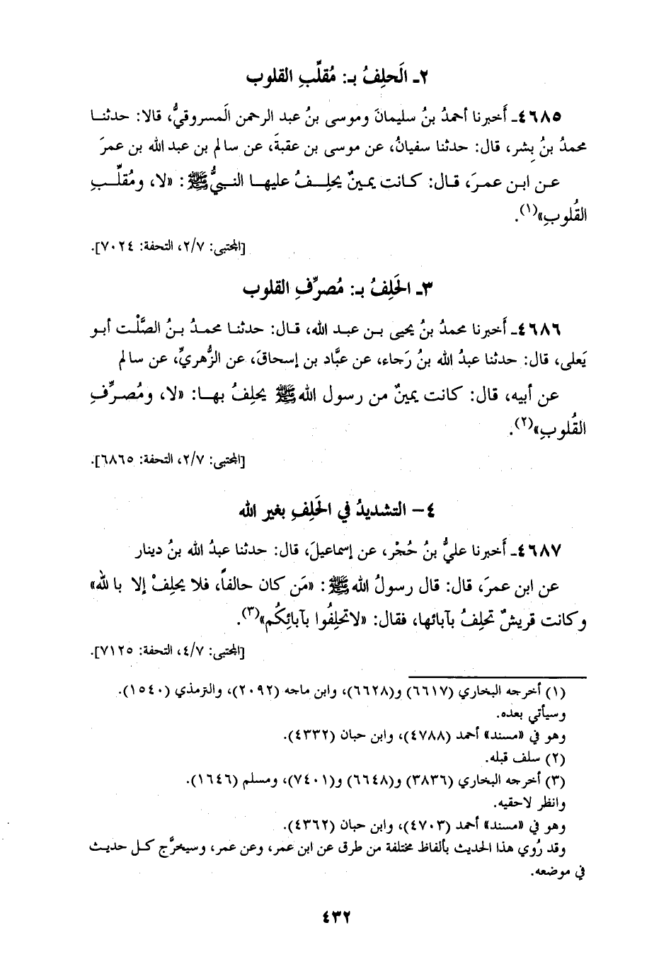 4686 - أَخْبَرَنَا مُحَمَّدُ بْنُ يَحْيَى بْنِ عَبْدِ اللهِ قَالَ: حَدَّثَنَا مُحَمَّدُ بْنُ الصَّلْتِ أَبُو يَعْلَى قَالَ: حَدَّثَنَا عَبْدُ اللهِ بْنُ رَجَاءٍ، عَنْ عَبَّادِ بْنِ إِسْحَاقَ، عَنِ الزُّهْرِيِّ، عَنْ سَالِمٍ، عَنْ أَبِيهِ قَالَ: " §كَانَتْ يَمِينُ رَسُولِ اللهِ صَلَّى اللهُ عَلَيْهِ وَسَلَّمَ يَحْلِفُ بِهَا: لَا وَمُصَرِّفِ الْقُلُوبِ "