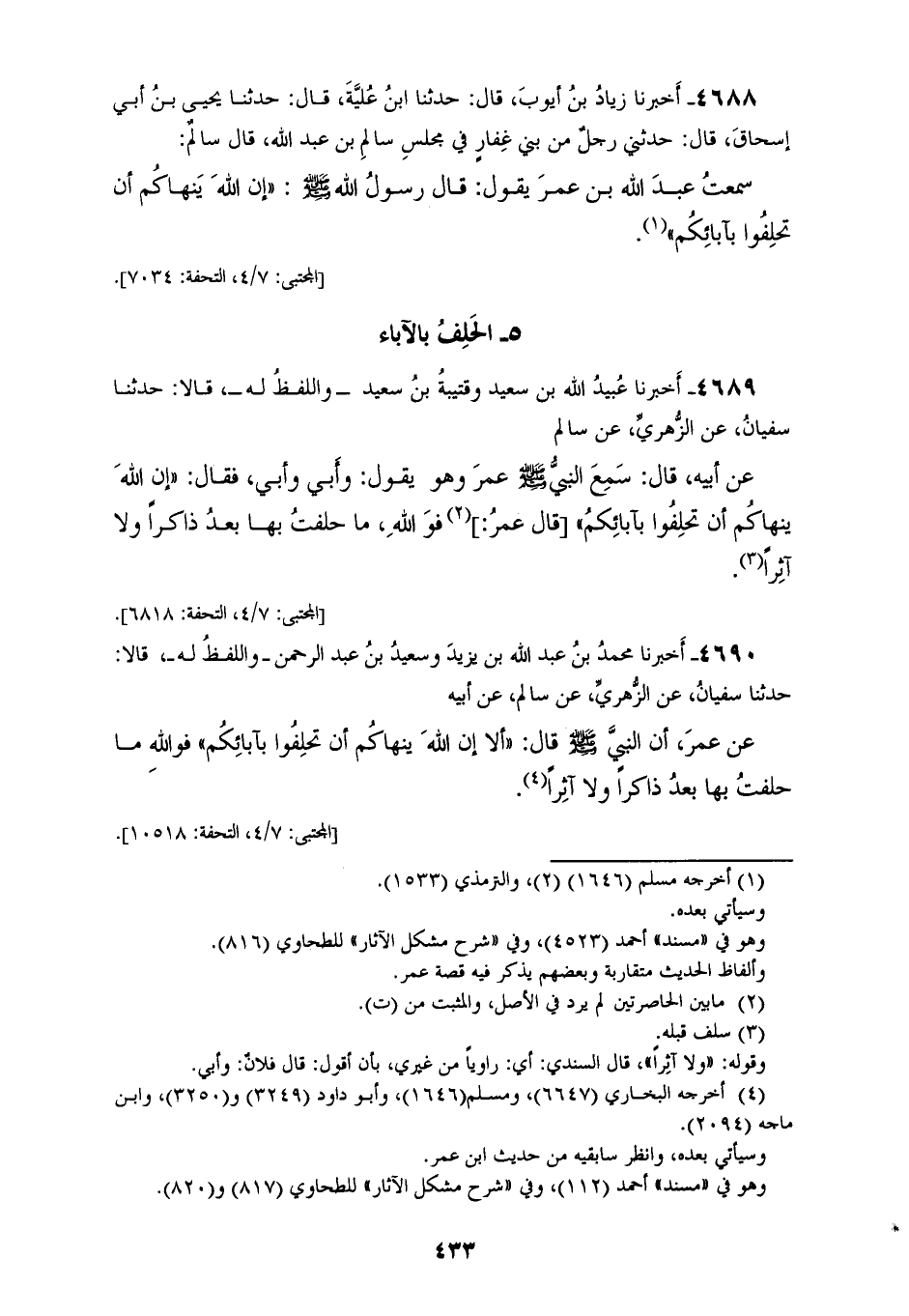 4690 - أَخْبَرَنَا مُحَمَّدُ بْنُ عَبْدِ اللهِ بْنِ يَزِيدَ، وَسَعِيدُ بْنُ عَبْدِ الرَّحْمَنِ، وَاللَّفْظُ لَهُ، قَالَا: حَدَّثَنَا سُفْيَانُ، عَنِ الزُّهْرِيِّ، عَنْ سَالِمٍ، عَنْ أَبِيهِ، عَنْ عُمَرَ، أَنَّ النَّبِيَّ صَلَّى اللهُ عَلَيْهِ وَسَلَّمَ قَالَ: «§أَلَا إِنَّ اللهَ يَنْهَاكُمْ أَنْ تَحْلِفُوا بِآبَائِكُمْ، فَوَاللهِ مَا حَلَفْتُ بِهَا بَعْدُ ذَاكِرًا وَلَا آثِرًا»
