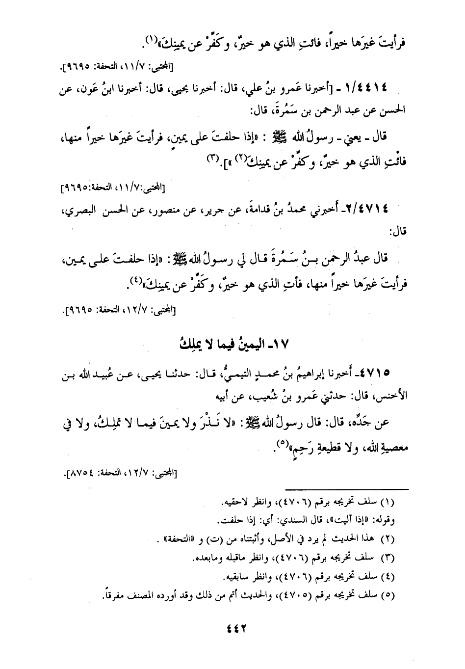 أَخْبَرَنِي مُحَمَّدُ بْنُ قُدَامَةَ، عَنْ جَرِيرٍ، عَنْ مَنْصُورٍ، عَنِ الْحَسَنِ الْبَصْرِيِّ، قَالَ: قَالَ عَبْدُ الرَّحْمَنِ بْنُ سَمُرَةَ: قَالَ لِي رَسُولُ اللهِ صَلَّى اللهُ عَلَيْهِ وَسَلَّمَ: «إِذَا §حَلَفْتَ عَلَى يَمِينٍ، فَرَأَيْتَ غَيْرَهَا خَيْرًا مِنْهَا، فَأْتِ الَّذِي هُوَ خَيْرٌ وَكَفِّرْ عَنْ يَمِينِكَ»