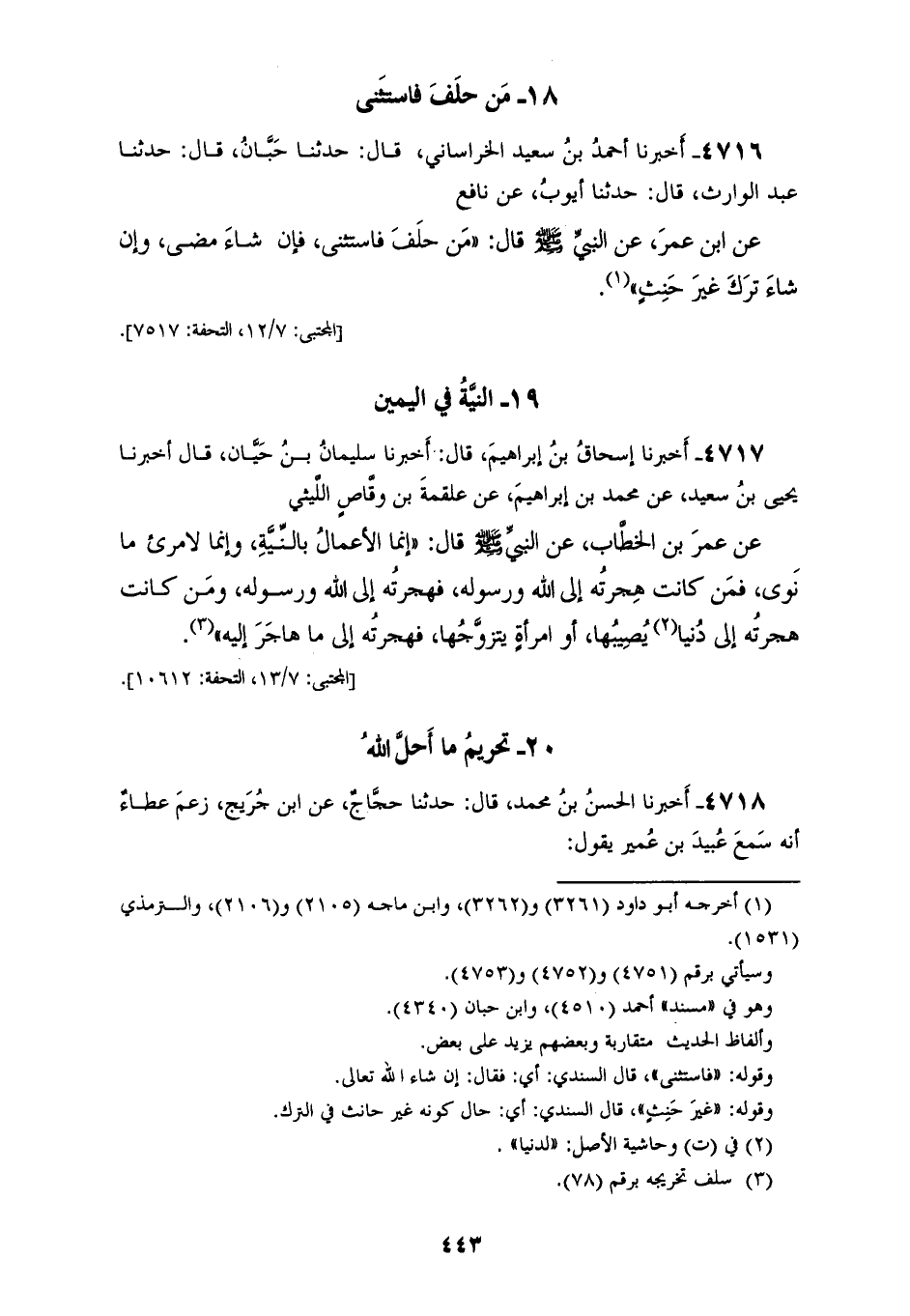 4716 - أَخْبَرَنَا أَحْمَدُ بْنُ سَعِيدٍ الْخُرَاسَانِيُّ، قَالَ: حَدَّثَنَا حَبَّانُ، قَالَ: حَدَّثَنَا عَبْدُ الْوَارِثِ، قَالَ: حَدَّثَنَا أَيُّوبُ، عَنْ نَافِعٍ، عَنِ ابْنِ عُمَرَ، عَنِ النَّبِيِّ صَلَّى اللهُ عَلَيْهِ وَسَلَّمَ قَالَ: «§مَنْ حَلَفَ فَاسْتَثْنَى، فَإِنْ شَاءَ مَضَّى، وَإِنْ شَاءَ تَرَكَ غَيْرَ حَنِثٍ»
