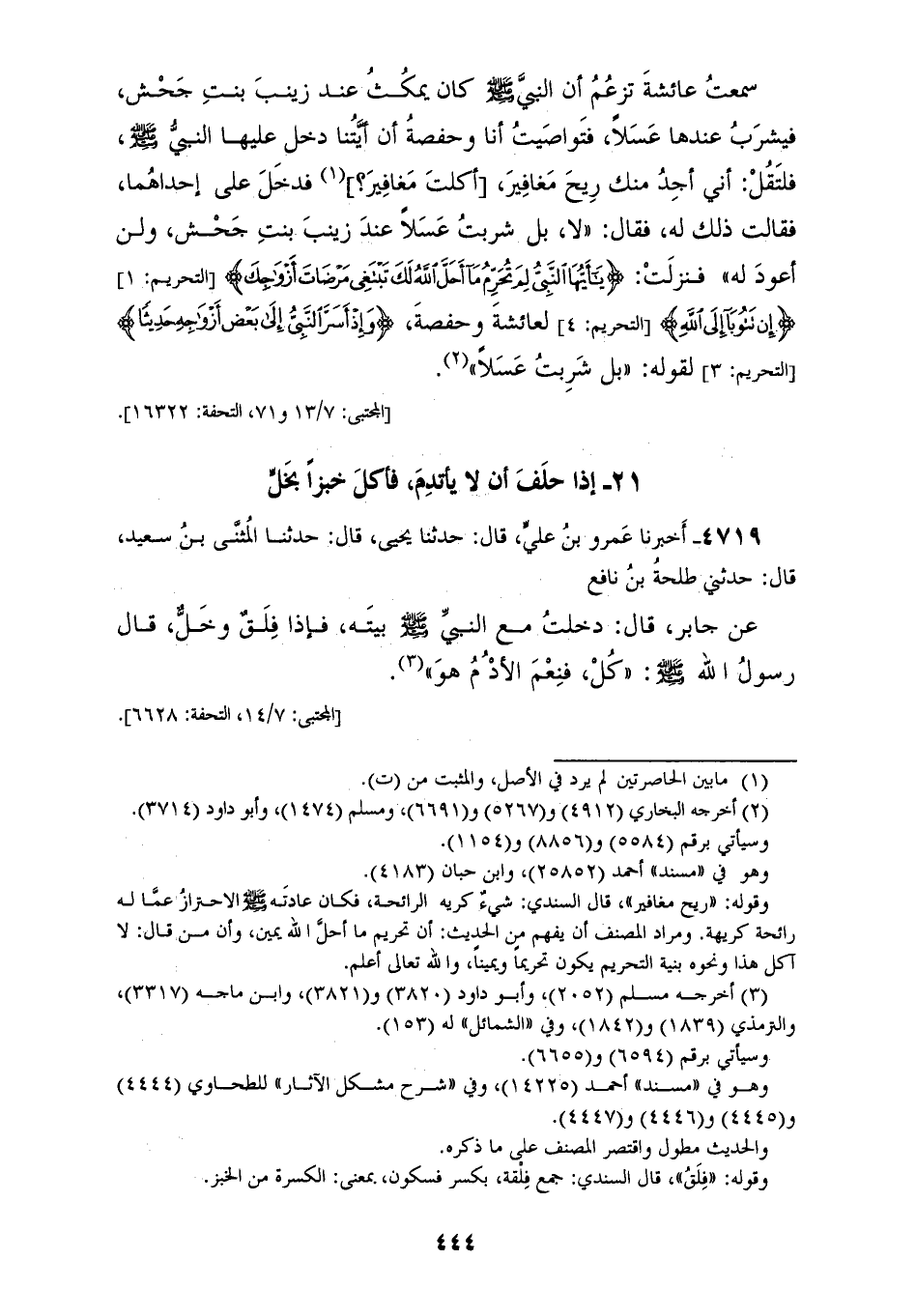 4718 - أَخْبَرَنَا الْحَسَنُ بْنُ مُحَمَّدٍ، قَالَ: حَدَّثَنَا حَجَّاجٌ، عَنِ ابْنِ جُرَيْجٍ، زَعَمَ عَطَاءٌ أَنَّهُ سَمِعَ عُبَيْدَ بْنَ عُمَيْرٍ، يَقُولُ: سَمِعْتُ عَائِشَةَ، تَزْعُمُ أَنَّ النَّبِيَّ صَلَّى اللهُ عَلَيْهِ وَسَلَّمَ كَانَ §يَمْكُثُ عِنْدَ زَيْنَبَ بِنْتِ جَحْشٍ، فَيَشْرَبُ عِنْدَهَا عَسَلًا فَتَوَاصَيْتُ أَنَا وَحَفْصَةُ أَنَّ أَيَّتَنَا دَخَلَ عَلَيْهَا النَّبِيُّ صَلَّى اللهُ عَلَيْهِ وَسَلَّمَ، فَلْتَقُلْ إِنِّي أَجِدُ مِنْكَ رِيحَ مَغَافِيرَ أَكَلْتَ مَغَافِيرَ، فَدَخَلَ عَلَى إِحْدَاهُمَا فَقَالَتْ: ذَلِكَ لَهُ، فَقَالَ: «لَا بَلْ شَرِبْتُ عَسَلًا عِنْدَ زَيْنَبَ بِنْتِ جَحْشٍ، وَلَنْ أَعُودَ لَهُ»، فَنَزَلَتْ {يَا أَيُّهَا النَّبِيُّ لِمَ تُحَرِّمُ مَا أَحَلَّ اللهُ لَكَ تَبْتَغِي مَرْضَاةَ أَزْوَاجِكَ} {إِنْ تَتُوبَا إِلَى اللهِ} [التحريم: 4] لِعَائِشَةَ وَحَفْصَةَ {، وَإِذْ أَسَرَّ النَّبِيُّ إِلَى بَعْضِ أَزْوَاجِهِ حَدِيثًا} [التحريم: 3] لِقَوْلِهِ: «بَلْ شَرِبْتُ عَسَلًا»
