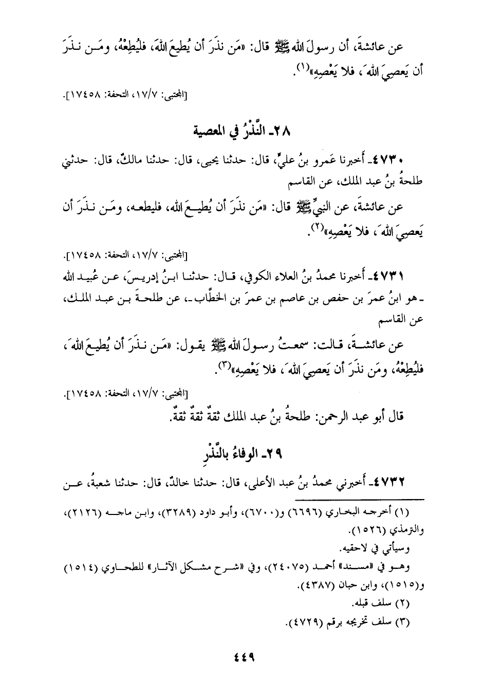 4731 - أَخْبَرَنَا مُحَمَّدُ بْنُ الْعَلَاءِ الْكُوفِيُّ، قَالَ: حَدَّثَنَا ابْنُ إِدْرِيسَ، عَنْ عُبَيْدِ اللهِ هُوَ ابْنُ عُمَرَ بْنِ حَفْصِ بْنِ عَاصِمِ بْنِ عُمَرَ بْنِ الْخَطَّابِ، عَنْ طَلْحَةَ بْنِ عَبْدِ الْمَلِكِ، عَنِ الْقَاسِمِ، عَنْ عَائِشَةَ، قَالَتْ: سَمِعْتُ رَسُولَ اللهِ صَلَّى اللهُ عَلَيْهِ وَسَلَّمَ يَقُولُ: «§مَنْ نَذَرَ أَنْ يُطِيعَ اللهَ فَلْيُطِعْهُ، وَمَنْ نَذَرَ أَنْ يَعْصِيَ اللهَ فَلَا يَعْصِهِ» قَالَ أَبُو عَبْدِ الرَّحْمَنِ: طَلْحَةَ بْنِ عَبْدِ الْمَلِكِ ثِقَةٌ ثِقَةٌ ثِقَةٌ