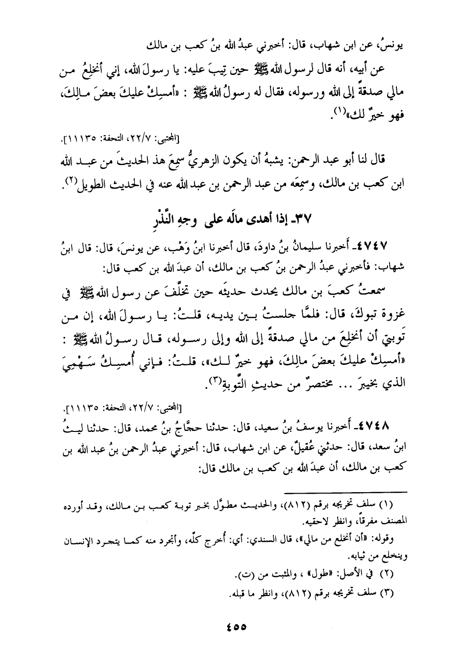 4747 - أَخْبَرَنَا سُلَيْمَانُ بْنُ دَاوُدَ، قَالَ: أَخْبَرَنَا ابْنُ وَهْبٍ، عَنْ يُونُسَ، قَالَ: قَالَ ابْنُ شِهَابٍ، فَأَخْبَرَنِي عَبْدُ الرَّحْمَنِ بْنُ كَعْبِ بْنِ مَالِكٍ، أَنَّ عَبْدَ اللهِ بْنِ كَعْبٍ قَالَ: سَمِعْتُ كَعْبَ بْنَ مَالِكٍ، يُحَدِّثُ حَدِيثِهِ حِينَ تَخَلَّفَ عَنْ رَسُولِ اللهِ صَلَّى اللهُ عَلَيْهِ وَسَلَّمَ فِي غَزْوَةِ تَبُوكَ، قَالَ: فَلَمَّا جَلَسْتُ بَيْنَ يَدَيْهِ قُلْتُ: يَا رَسُولَ اللهِ، إِنَّ مِنْ تَوْبَتِي أَنْ أَنْخَلِعَ مِنْ مَالِي صَدَقَةً إِلَى اللهِ وَإِلَى رَسُولِهِ، قَالَ رَسُولُ اللهِ صَلَّى اللهُ عَلَيْهِ وَسَلَّمَ: «§أَمْسِكْ عَلَيْكَ بَعْضَ مَالِكَ، فَهُوَ خَيْرٌ لَكَ». قُلْتُ: فَإِنِّي أَمْسِكُ سَهْمِيَ الَّذِي بِخَيْبَرَ " مُخْتَصَرٌ مِنْ حَدِيثِ التَّوْبَةِ