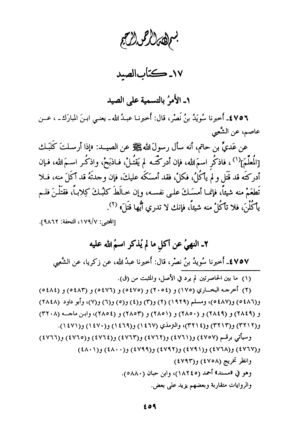 4756 - أَخْبَرَنَا سُوَيْدُ بْنُ نَصْرٍ، قَالَ: أَخْبَرَنَا عَبْدُ اللهِ يَعْنِي ابْنَ الْمُبَارَكِ، عَنْ عَاصِمٍ، عَنِ الشَّعْبِيِّ، عَنْ عَدِيِّ بْنِ حَاتِمٍ، أَنَّهُ سَأَلَ رَسُولَ اللهِ صَلَّى اللهُ عَلَيْهِ وَسَلَّمَ عَنِ الصَّيْدِ، فَقَالَ: «§إِذَا أَرْسَلْتَ كَلْبَكَ الْمُعَلَّمَ فَاذْكُرِ اسْمَ اللهِ، فَإِنْ أَدْرَكْتَهُ لَمْ يَقْتُلْ فَاذْبَحْ، وَاذْكُرِ اسْمَ اللهِ، فَإِنْ أَدْرَكْتَهُ قَدْ قَتَلَ وَلَمْ يَأْكُلْ فَكُلْ، فَقَدْ أَمْسَكَهُ عَلَيْكَ، فَإِنْ وَجَدْتَهُ قَدْ أَكَلَ مِنْهُ فَلَا تَطْعَمْ مِنْهُ شَيْئًا، فَإِنَّمَا أَمْسَكَ عَلَى نَفْسِهِ، وَإِنْ خَالَطَ كَلْبُكَ كِلَابًا فَقَتَلْنَ فَلَمْ يَأْكُلْنَ فَلَا تَأْكُلْ مِنْهُ شَيْئًا، فَإِنَّكَ لَا تَدْرِي أَيَّهَا قَتَلَ»