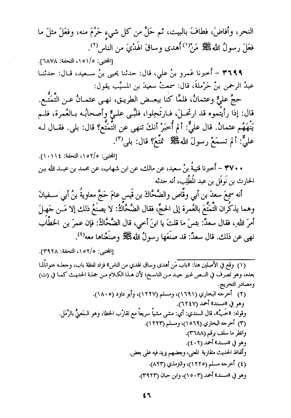 3699 - أَخْبَرَنَا عَمْرُو بْنُ عَلِيٍّ قَالَ: حَدَّثَنَا يَحْيَى بْنُ سَعِيدٍ قَالَ: حَدَّثَنَا عَبْدُ الرَّحْمَنِ بْنُ حَرْمَلَةَ قَالَ: سَمِعْتُ سَعِيدَ بْنَ الْمُسَيِّبِ، يَقُولُ: حَجَّ عَلِيٌّ وَعُثْمَانُ، فَلَمَّا كُنَّا بِبَعْضِ الطَّرِيقِ «§نَهَى عُثْمَانُ عَنِ التَّمَتُّعِ» قَالَ: «إِذَا رَأَيْتُمُوهُ قَدِ ارْتَحَلَ فَارْتَحِلُوا»، فَلَبَّى عَلِيٌّ وَأَصْحَابُهُ بِالْعُمْرَةِ فَلَمْ يَنْهَهُمْ عُثْمَانُ، قَالَ عَلِيٌّ: أَلَمْ أُخْبَرْ أَنَّكَ تَنْهَى عَنِ التَّمَتُّعِ؟ قَالَ: بَلَى، فَقَالَ لَهُ عَلِيٌّ: أَلَمْ تَسْمَعْ رَسُولَ اللهِ صَلَّى اللهُ عَلَيْهِ وَسَلَّمَ تَمَتَّعَ؟ قَالَ: بَلَى