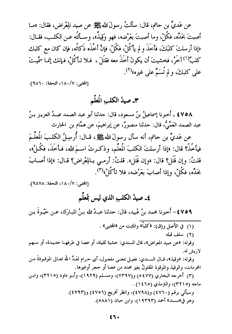 4758 - أَخْبَرَنَا إِسْمَاعِيلُ بْنُ مَسْعُودٍ، قَالَ: حَدَّثَنَا أَبُو عَبْدِ الصَّمَدِ عَبْدُ الْعَزِيزِ بْنُ عَبْدِ الصَّمَدِ الْعَمِّيُّ، قَالَ: حَدَّثَنَا مَنْصُورٌ، عَنْ إِبْرَاهِيمَ، عَنْ هَمَّامِ بْنِ الْحَارِثِ، عَنْ عَدِيِّ بْنِ حَاتِمٍ، أَنَّهُ سَأَلَ رَسُولَ اللهِ صَلَّى اللهُ عَلَيْهِ وَسَلَّمَ قَالَ: أُرْسِلُ الْكَلْبَ الْمُعَلَّمَ فَيَأْخُذُ، قَالَ: «إِذَا §أَرْسَلْتَ الْكَلْبَ الْمُعَلَّمَ وَذَكَرْتَ اسْمَ اللهِ فَأَخَذَ فَكُلْ»، قُلْتُ: وَإِنْ قَتَلَ؟ قَالَ: «وَإِنْ قَتَلَ»، قُلْتُ: أَرْمِي بِالْمِعْرَاضِ قَالَ: «إِذَا أَصَابَ بِحَدِّهِ فَكُلْ، وَإِذَا أَصَابَ بِعَرْضِهِ فَلَا تَأْكُلْ»