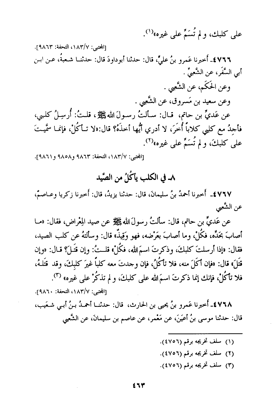 4766 - أَخْبَرَنَا عَمْرُو بْنُ عَلِيٍّ، قَالَ: حَدَّثَنَا أَبُو دَاوُدَ، قَالَ: حَدَّثَنَا شُعْبَةَ، عَنِ ابْنِ أَبِي السَّفَرِ، عَنِ الشَّعْبِيِّ، وَعَنِ الْحَكَمِ، عَنِ الشَّعْبِيِّ، وَعَنْ سَعِيدِ بْنِ مَسْرُوقٍ، عَنِ الشَّعْبِيِّ، عَنْ عَدِيِّ بْنِ حَاتِمٍ، قَالَ: سَأَلْتُ رَسُولَ اللهِ صَلَّى اللهُ عَلَيْهِ وَسَلَّمَ قُلْتُ: أُرْسِلُ كَلْبِي فَأَجِدُ مَعَ كَلْبِي كِلَابًا أُخَرَ لَا أَدْرِي أَيُّهُا أَخَذَهُ، قَالَ: «§لَا تَأْكُلْ فَإِنَّمَا سَمَّيْتَ عَلَى كَلْبِكَ وَلَمْ تُسَمِّ عَلَى غَيْرِهِ»