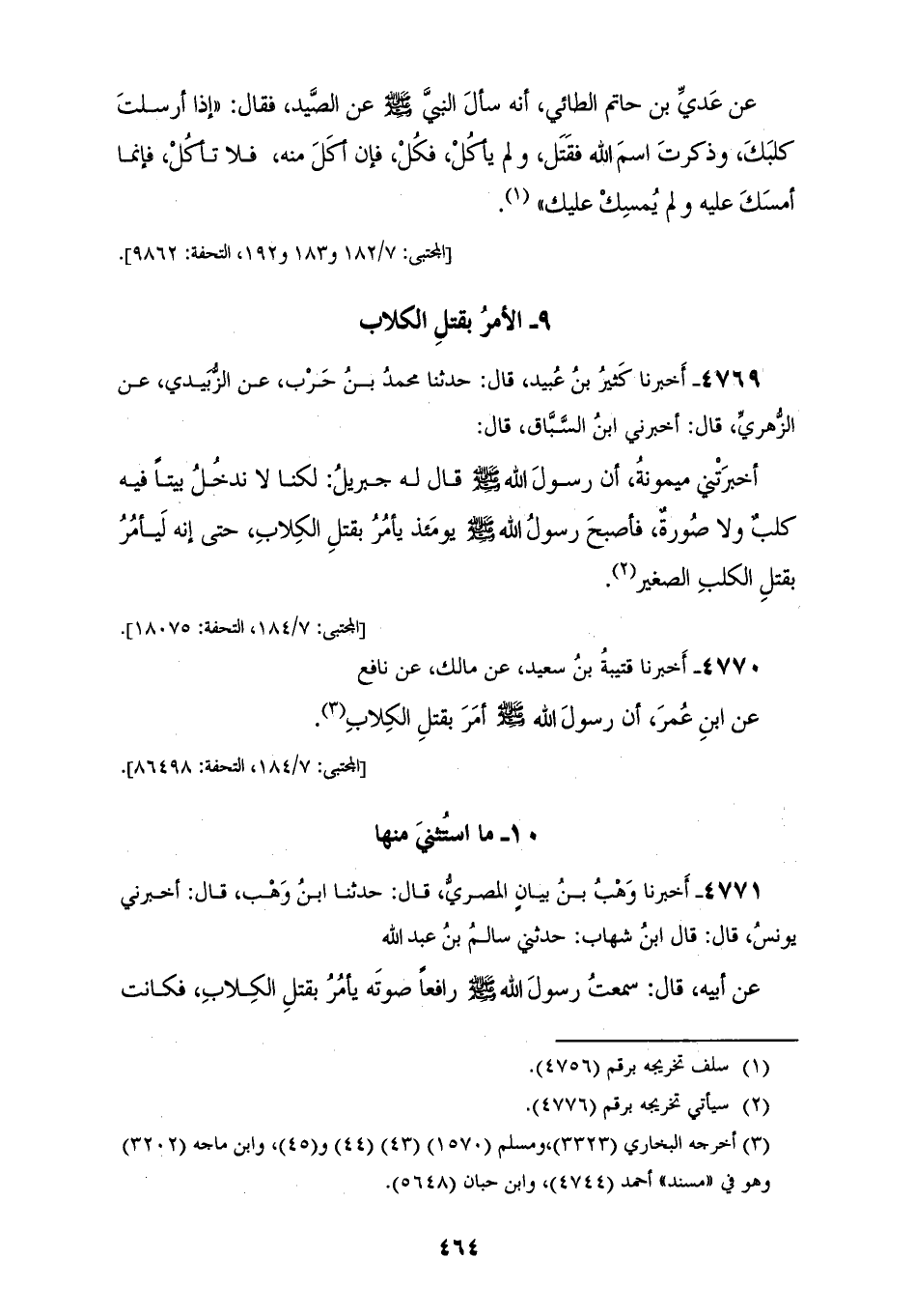 4770 - أَخْبَرَنَا قُتَيْبَةُ بْنُ سَعِيدٍ، عَنْ مَالِكٍ، عَنْ نَافِعٍ، عَنِ ابْنِ عُمَرَ، أَنَّ رَسُولَ اللهِ صَلَّى اللهُ عَلَيْهِ وَسَلَّمَ «§أَمَرَ بِقَتْلِ الْكِلَابِ»