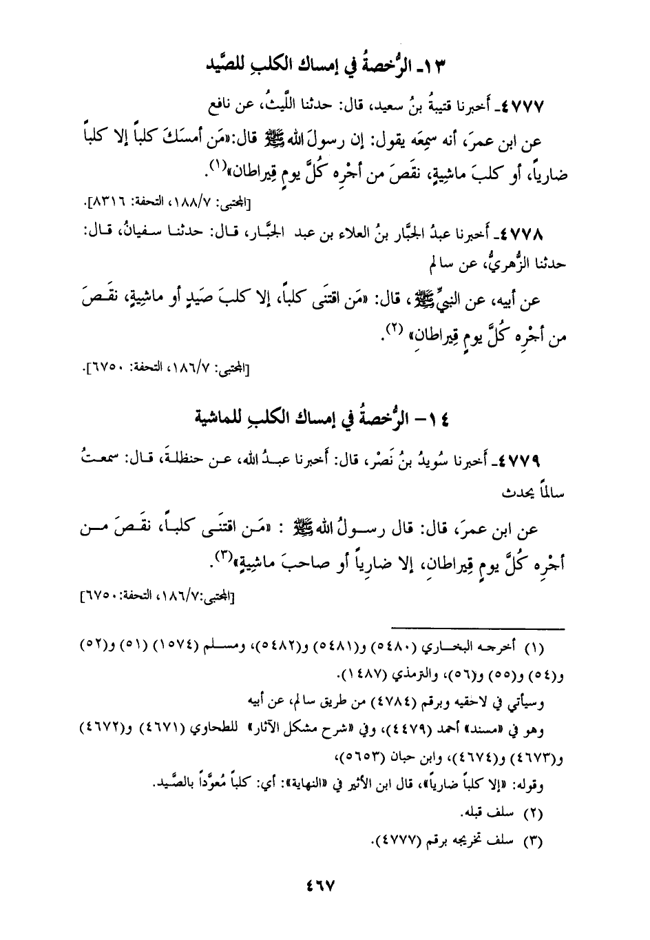 4778 - أَخْبَرَنَا عَبْدُ الْجَبَّارِ بْنُ الْعَلَاءِ بن عبد الجبار، قال: حَدَّثَنَا سُفْيَانَ، قَالَ: حَدَّثَنَا الزُّهْرِيُّ، عَنْ سَالِمٍ، عَنْ أَبِيهِ، عَنِ النَّبِيِّ صَلَّى اللهُ عَلَيْهِ وَسَلَّمَ قَالَ: «§مَنِ اقْتَنَى كَلْبًا إِلَّا كَلْبَ صَيْدٍ أَوْ مَاشِيَةٍ نَقَصَ مِنْ أَجْرِهِ كُلَّ يَوْمٍ قِيرَاطَانِ»