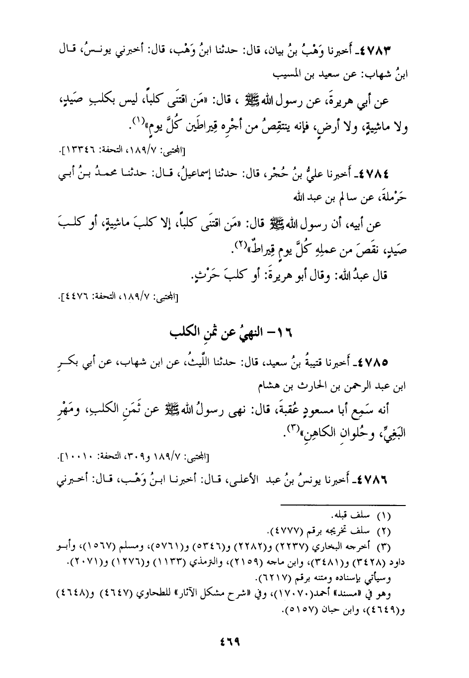 4785 - أَخْبَرَنَا قُتَيْبَةُ بْنُ سَعِيدٍ، قَالَ: حَدَّثَنَا اللَّيْثُ، عَنِ ابْنِ شِهَابٍ، عَنْ أَبِي بَكْرِ بْنِ عَبْدِ الرَّحْمَنِ بْنِ الْحَارِثِ بْنِ هِشَامٍ، أَنَّهُ سَمِعَ أَبَا مَسْعُودٍ عُقْبَةَ، قَالَ: نَهَى رَسُولُ اللهِ صَلَّى اللهُ عَلَيْهِ وَسَلَّمَ «§عَنْ ثَمَنِ الْكَلْبِ، وَمَهْرِ الْبَغِيِّ، وَحُلْوَانِ الْكَاهِنِ»