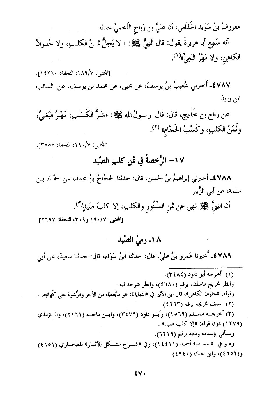 4788 - أَخْبَرَنِي إِبْرَاهِيمُ بْنُ الْحَسَنِ، قَالَ: حَدَّثَنَا الحَجَّاجُ بْنُ مُحَمَّدٍ، عَنْ حَمَّادِ بْنِ سَلَمَةَ، عَنْ أَبِي الزُّبَيْرِ، أَنَّ النَّبِيَّ صَلَّى اللهُ عَلَيْهِ وَسَلَّمَ «§نَهَى عَنْ ثَمَنِ السِّنَّوْرِ، وَالْكَلْبِ إِلَّا كَلْبَ صَيْدٍ»