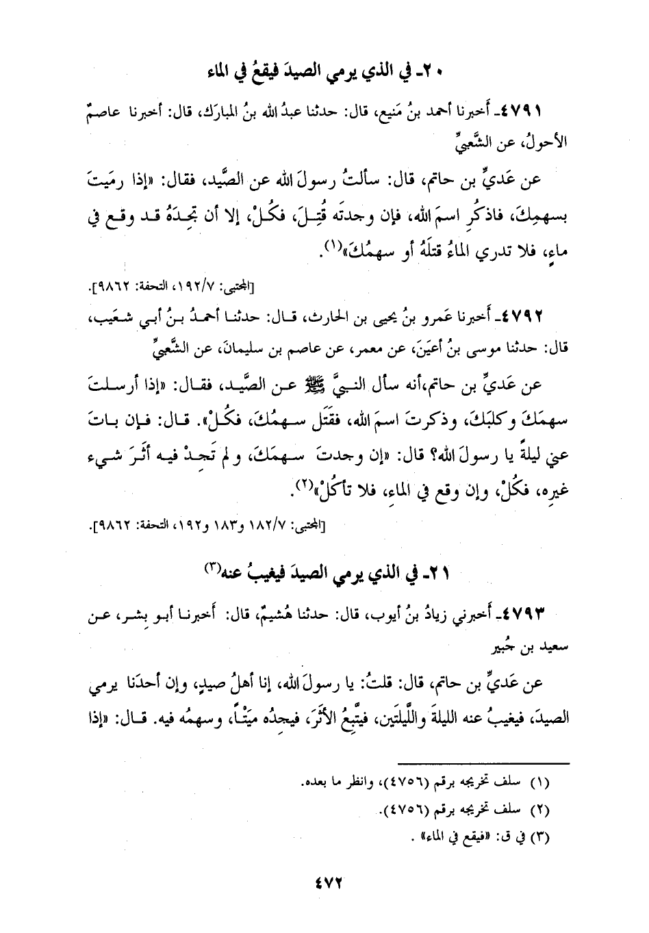 4791 - أَخْبَرَنَا أَحْمَدُ بْنُ مَنِيعٍ، قَالَ: حَدَّثَنَا عَبْدُ اللهِ بْنُ الْمُبَارَكِ، قَالَ: أَخْبَرَنَا عَاصِمٌ الْأَحْوَلُ، عَنِ الشَّعْبِيِّ، عَنْ عَدِيِّ بْنِ حَاتِمٍ، قَالَ: سَأَلْتُ رَسُولَ اللهِ عَنِ الصَّيْدِ، فَقَالَ: «إِذَا §رَمَيْتَ سَهْمَكَ فَاذْكُرِ اسْمَ اللهِ، فَإِنْ وَجَدْتَهُ قَتَلَ فَكُلْ إِلَّا أَنْ تَجِدَهُ قَدْ وَقَعَ فِي مَاءٍ، فَلَا تَدْرِي الْمَاءُ قَتَلَهُ أَوْ سَهْمُكَ»