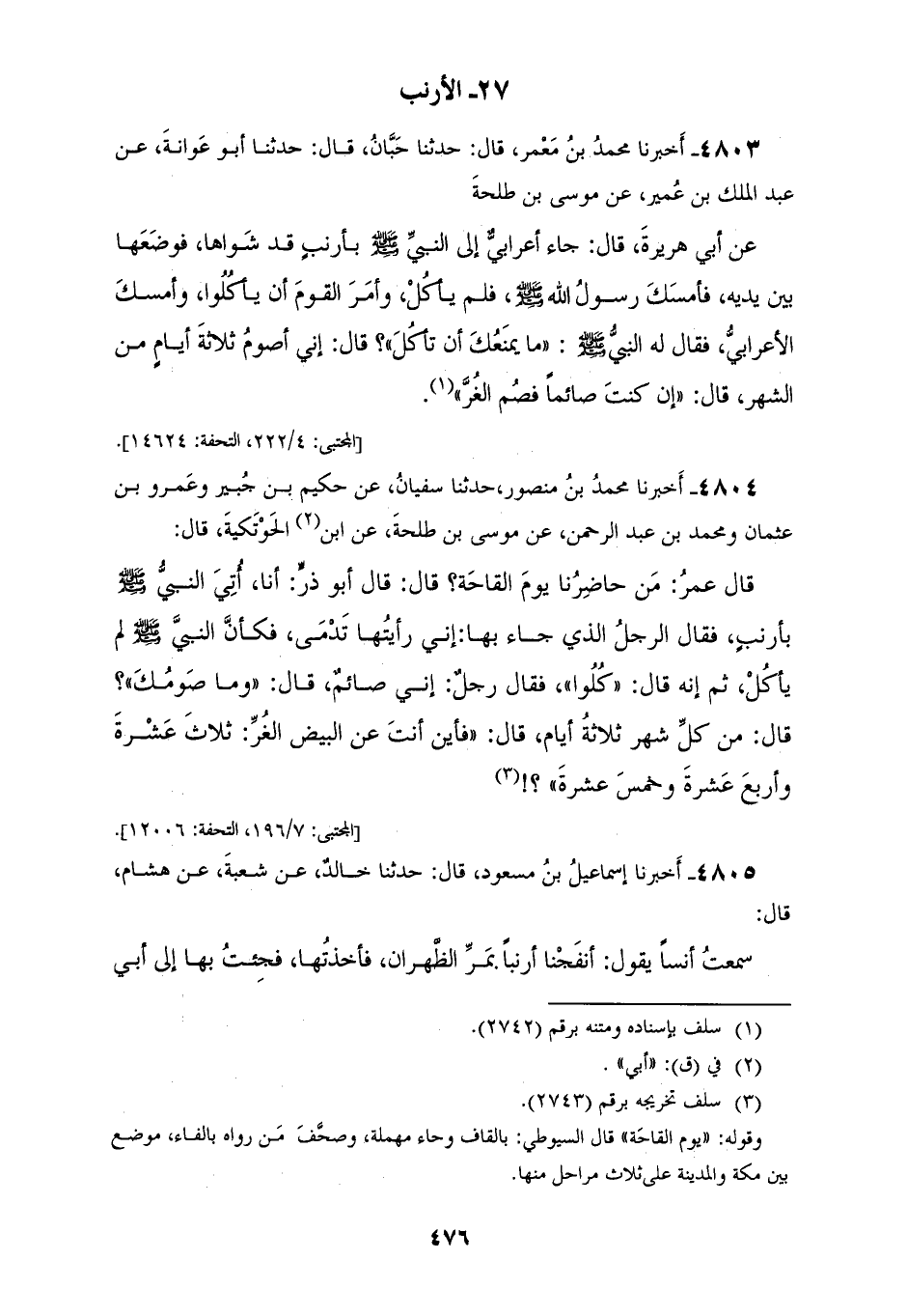 4803 - أَخْبَرَنَا مُحَمَّدُ بْنُ مَعْمَرٍ، قَالَ: حَدَّثَنَا حَبَّانُ، قَالَ: حَدَّثَنَا أَبُو عَوَانَةَ، عَنْ عَبْدِ الْمَلِكِ بْنِ عُمَيْرٍ، عَنْ مُوسَى بْنِ طَلْحَةَ، عَنْ أَبِي هُرَيْرَةَ، قَالَ: جَاءَ أَعْرَابِيٌّ إِلَى النَّبِيِّ صَلَّى اللهُ عَلَيْهِ وَسَلَّمَ بِأَرْنَبٍ قَدْ شَوَاهَا فَوَضَعَهَا بَيْنَ يَدَيْهِ، فَأَمْسَكَ رَسُولُ اللهِ صَلَّى اللهُ عَلَيْهِ وَسَلَّمَ فَلَمْ يَأْكُلْ، وَأَمَرَ الْقَوْمَ أَنْ يَأْكُلُوا وَأَمْسَكَ الْأَعْرَابِيُّ، فَقَالَ لَهُ النَّبِيُّ صَلَّى اللهُ عَلَيْهِ وَسَلَّمَ: «§مَا يَمْنَعُكَ أَنْ تَأْكُلَ؟» قَالَ: إِنِّي أَصُومُ ثَلَاثَةَ أَيَّامٍ مِنْ الشَّهْرِ، قَالَ: «إِنْ كُنْتَ صَائِمًا فَصُمِ الْغُرَّ»