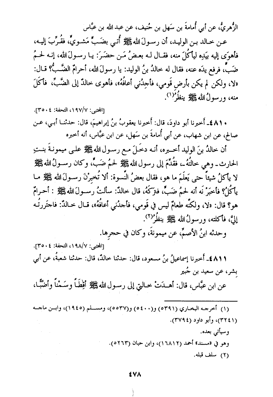 4810 - أَخْبَرَنَا أَبُو دَاوُدَ، قَالَ: أَخْبَرَنَا يَعْقُوبُ بْنُ إِبْرَاهِيمَ، قَالَ: حَدَّثَنَا أَبِي، عَنْ صَالِحٍ، عَنِ ابْنِ شِهَابٍ، عَنْ أَبِي أُمَامَةَ بْنِ سَهْلٍ، عَنِ ابْنِ عَبَّاسٍ، أَنَّهُ أَخْبَرَهُ أَنَّ خَالِدَ بْنَ الْوَلِيدِ، أَخْبَرَهُ أَنَّهُ، دَخَلَ مَعَ رَسُولِ اللهِ صَلَّى اللهُ عَلَيْهِ وَسَلَّمَ عَلَى مَيْمُونَةَ بِنْتِ الْحَارِثِ وَهِيَ خَالَتُهُ، فَقُدِّمَ إِلَى رَسُولِ اللهِ صَلَّى اللهُ عَلَيْهِ وَسَلَّمَ لَحْمُ ضَبٍّ، وَكَانَ رَسُولُ اللهِ صَلَّى اللهُ عَلَيْهِ وَسَلَّمَ لَا يَأْكُلُ شَيْئًا حَتَّى يَعْلَمَ مَا هُوَ، فَقَالَ بَعْضُ النِّسْوَةِ: §أَلَا تُخْبِرْنَ رَسُولَ اللهِ صَلَّى اللهُ عَلَيْهِ وَسَلَّمَ مَا يَأْكُلُ؟ فَأَخْبَرْنَهُ أَنَّهُ لَحْمُ ضَبٍّ فَتَرَكَهُ، قَالَ خَالِدٌ: سَأَلْتُ رَسُولَ اللهِ صَلَّى اللهُ عَلَيْهِ وَسَلَّمَ أَحَرَامٌ هُوَ؟ قَالَ: «لَا وَلَكِنَّهُ طَعَامٌ لَيْسَ فِي قَوْمِي فَأَجِدُنِي أَعَافُهُ» قَالَ خَالِدٌ: فَاجْتَرَرْتُهُ إِلَيَّ فَأَكَلْتُهُ وَرَسُولُ اللهِ صَلَّى اللهُ عَلَيْهِ وَسَلَّمَ يَنْظُرُ. وَحَدَّثَهُ ابْنُ الْأَصَمِّ عَنْ مَيْمُونَةَ وَكَانَ فِي حَجْرِهَا