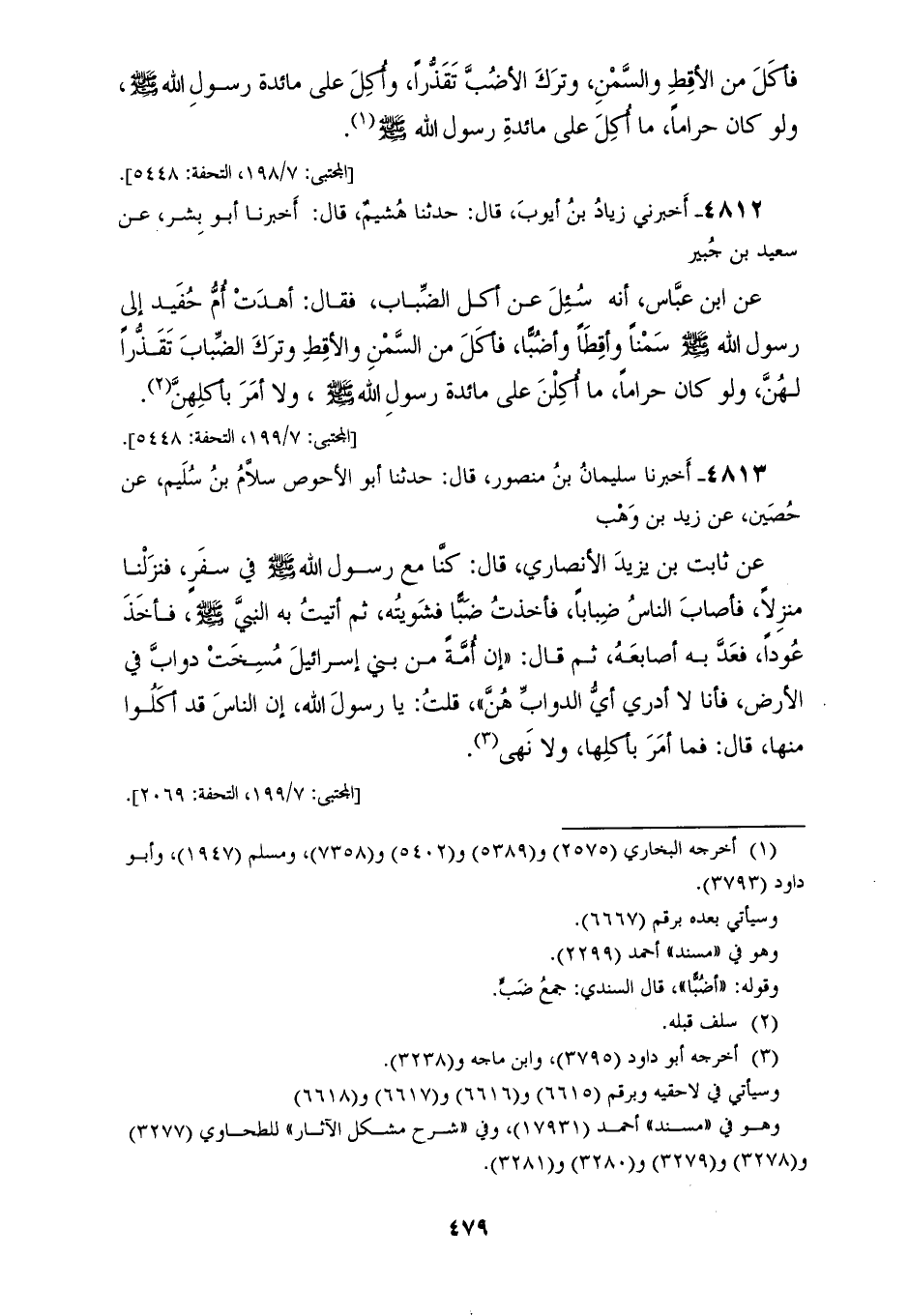 4812 - أَخْبَرَنِي زِيَادُ بْنُ أَيُّوبَ، قَالَ: حَدَّثَنَا هُشَيْمٌ، قَالَ: أَخْبَرَنَا أَبُو بِشْرٍ، عَنْ سَعِيدِ بْنِ جُبَيْرٍ، عَنِ ابْنِ عَبَّاسٍ، أَنَّهُ سُئِلَ عَنْ أَكْلِ الضِّبَابِ، فَقَالَ: أَهْدَتْ أُمُّ حُفَيْدٍ إِلَى رَسُولِ اللهِ صَلَّى اللهُ عَلَيْهِ وَسَلَّمَ «§سَمْنًا وَأَقِطًا وَأَضُبًّا، فَأَكَلَ مِنَ السَّمْنِ وَالْأَقِطِ، وَتَرَكَ الضِّبَابَ تَقَذُّرًا لَهُنَّ، وَلَوْ كَانَ حَرَامًا مَا أُكِلَ عَلَى مَائِدَةِ رَسُولِ اللهِ صَلَّى اللهُ عَلَيْهِ وَسَلَّمَ وَلَا أَمَرَ بِأَكْلِهِنَّ»