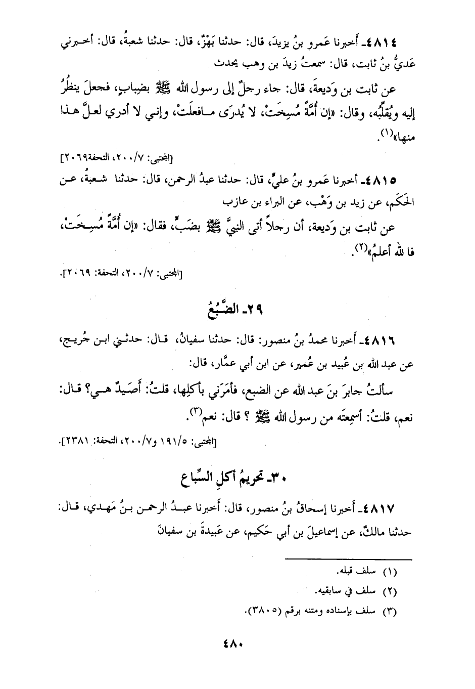 4815 - أَخْبَرَنَا عَمْرُو بْنُ عَلِيٍّ، قَالَ: حَدَّثَنَا عَبْدُ الرَّحْمَنِ، قَالَ: حَدَّثَنَا شُعْبَةُ، عَنِ الْحَكَمِ، عَنْ زَيْدِ بْنِ وَهْبٍ، عَنِ الْبَرَاءِ بْنِ عَازِبٍ، عَنْ ثَابِتِ بْنِ وَدِيعَةَ، أَنَّ رَجُلًا، أَتَى النَّبِيَّ صَلَّى اللهُ عَلَيْهِ وَسَلَّمَ بِضَبٍّ، فَقَالَ: «إِنَّ §أُمَّةً مُسِخَتْ فَاللهُ أَعْلَمُ»
