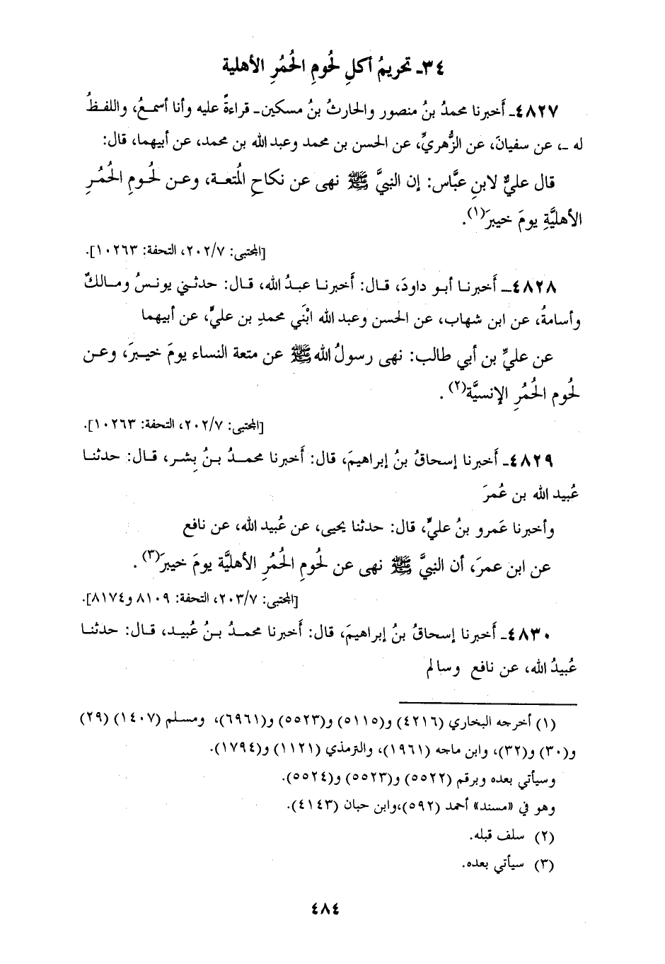 4827 - أَخْبَرَنَا مُحَمَّدُ بْنُ مَنْصُورٍ، وَالْحَارِثُ بْنُ مِسْكِينٍ، قِرَاءَةً عَلَيْهِ، وَأَنَا أَسْمَعُ، وَاللَّفْظُ لَهُ عَنْ سُفْيَانَ، عَنِ الزُّهْرِيِّ، عَنِ الْحَسَنِ بْنِ مُحَمَّدٍ، وَعَبْدِ اللهِ بْنِ مُحَمَّدٍ، عَنْ أَبِيهِمَا، قَالَ: قَالَ عَلِيٌّ لِابْنِ عَبَّاسٍ: إِنَّ النَّبِيَّ صَلَّى اللهُ عَلَيْهِ وَسَلَّمَ «§نَهَى عَنْ نِكَاحِ الْمُتْعَةِ، وَعَنْ لُحُومِ الْحُمُرِ الْأَهْلِيَّةِ يَوْمَ خَيْبَرَ»