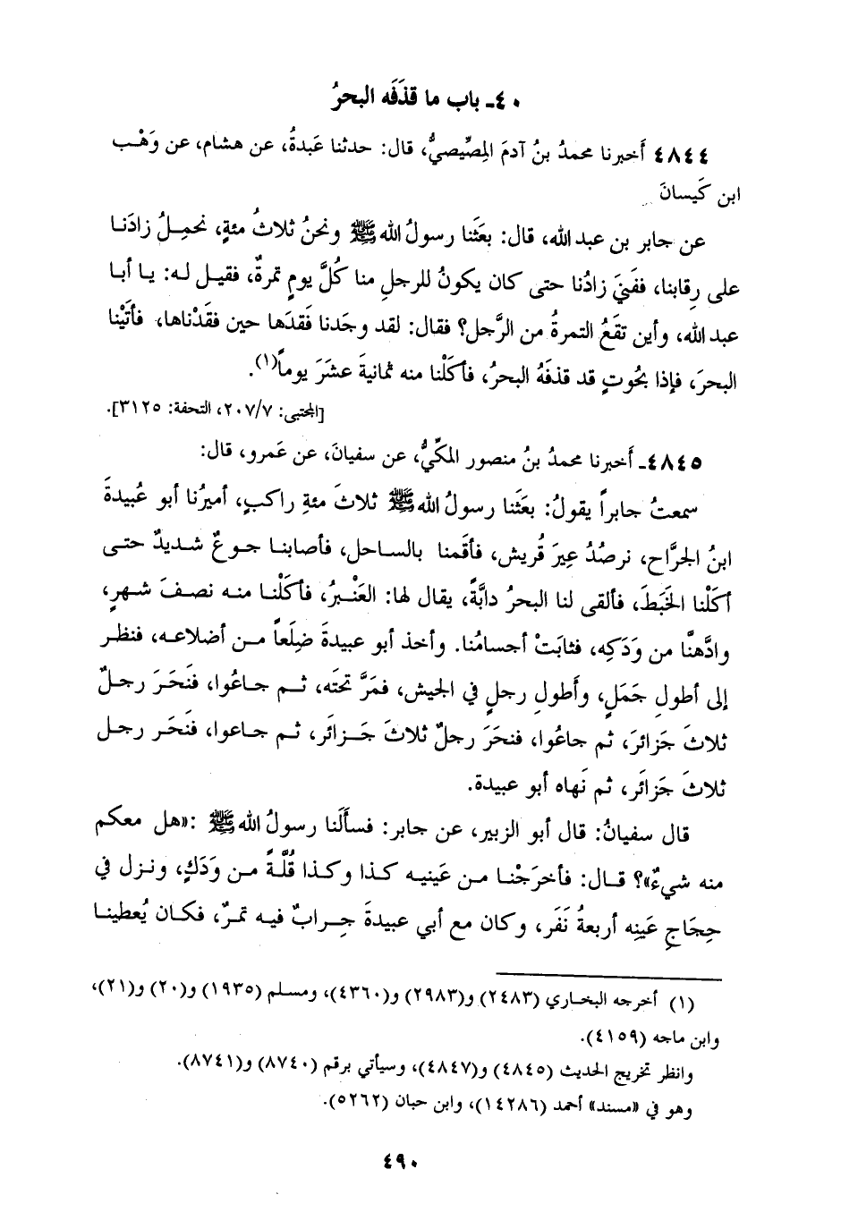 4845 - أَخْبَرَنَا مُحَمَّدُ بْنُ مَنْصُورٍ الْمَكِّيُّ، عَنْ سُفْيَانَ، عَنْ عَمْرٍو، قَالَ: سَمِعْتُ جَابِرًا، يَقُولُ: بَعَثَنَا رَسُولُ اللهِ صَلَّى اللهُ عَلَيْهِ وَسَلَّمَ ثَلَاثَمِائَةِ رَاكِبٍ أَمِيرُنَا أَبُو عُبَيْدَةَ بْنُ الْجَرَّاحِ نَرْصُدُ عِيرَ قُرَيْشٍ، فَأَقَمْنَا بِالسَّاحِلِ فَأَصَابَنَا جُوعٌ شَدِيدٌ حَتَّى أَكَلْنَا الْخَبَطَ، فَأَلْقَى لَنَا الْبَحْرُ دَابَّةً يُقَالُ لَهَا الْعَنْبَرُ، فَأَكَلْنَا مِنْهُ نِصْفَ شَهْرٍ وَادَّهَنَّا مِنْ وَدَكِهِ فَثَابَتْ أَجْسَامُنَا، وَأَخَذَ أَبُو عُبَيْدَةَ ضِلْعًا مِنْ أَضْلَاعِهِ فَنَظَرَ إِلَى أَطْوَلِ جَمَلٍ، وَأَطْوَلِ رَجُلٍ فِي الْجَيْشِ فَمَرَّ تَحْتَهُ، ثُمَّ جَاعُوا فَنَحَرَ رَجُلٌ ثَلَاثَ جَزَائِرَ ثُمَّ جَاعُوا فَنَحَرَ رَجُلٌ ثَلَاثَ جَزَائِرَ، ثُمَّ جَاعُوا فَنَحَرَ رَجُلٌ ثَلَاثَ جَزَائِرَ، ثُمَّ نَهَاهُ أَبُو عُبَيْدَةَ، قَالَ سُفْيَانُ: قَالَ أَبُو الزُّبَيْرِ عَنْ جَابِرٍ: فَسَأَلْنَا رَسُولَ اللهِ صَلَّى اللهُ عَلَيْهِ وَسَلَّمَ، فَقَالَ: «§هَلْ مَعَكُمْ مِنْهُ شَيْءٌ؟» قَالَ: فَأَخْرَجْنَا مِنْ عَيْنَيْهِ كَذَا وَكَذَا قُلَّةً مِنْ وَدَكٍ وَنَزَلَ فِي حَجَّاجِ عَيْنِهِ أَرْبَعَةُ نَفَرٍ وَكَانَ مَعَ أَبِي عُبَيْدَةَ جِرَابٌ فِيهِ تَمْرٌ، فَكَانَ يُعْطِينَا الْقَبْضَةَ ثُمَّ صَارَ إِلَى التَّمْرَةِ، فَلَمَّا فَقَدْنَاهَا وَجَدْنَا فَقْدَهَا